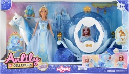 Det fortryllende sæt til små eventyrelskere rummer alt til kongelig sjov: en prinsesse i glitrende blå kjole med krone, en majestætisk hvid hest og en stor karet med gennemsigtige elementer, der lyser under legen. Dukken har langt blondt hår, og de detaljerede accessories stimulerer fantasien og historiefortællingen.
