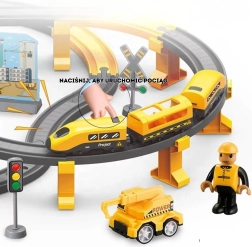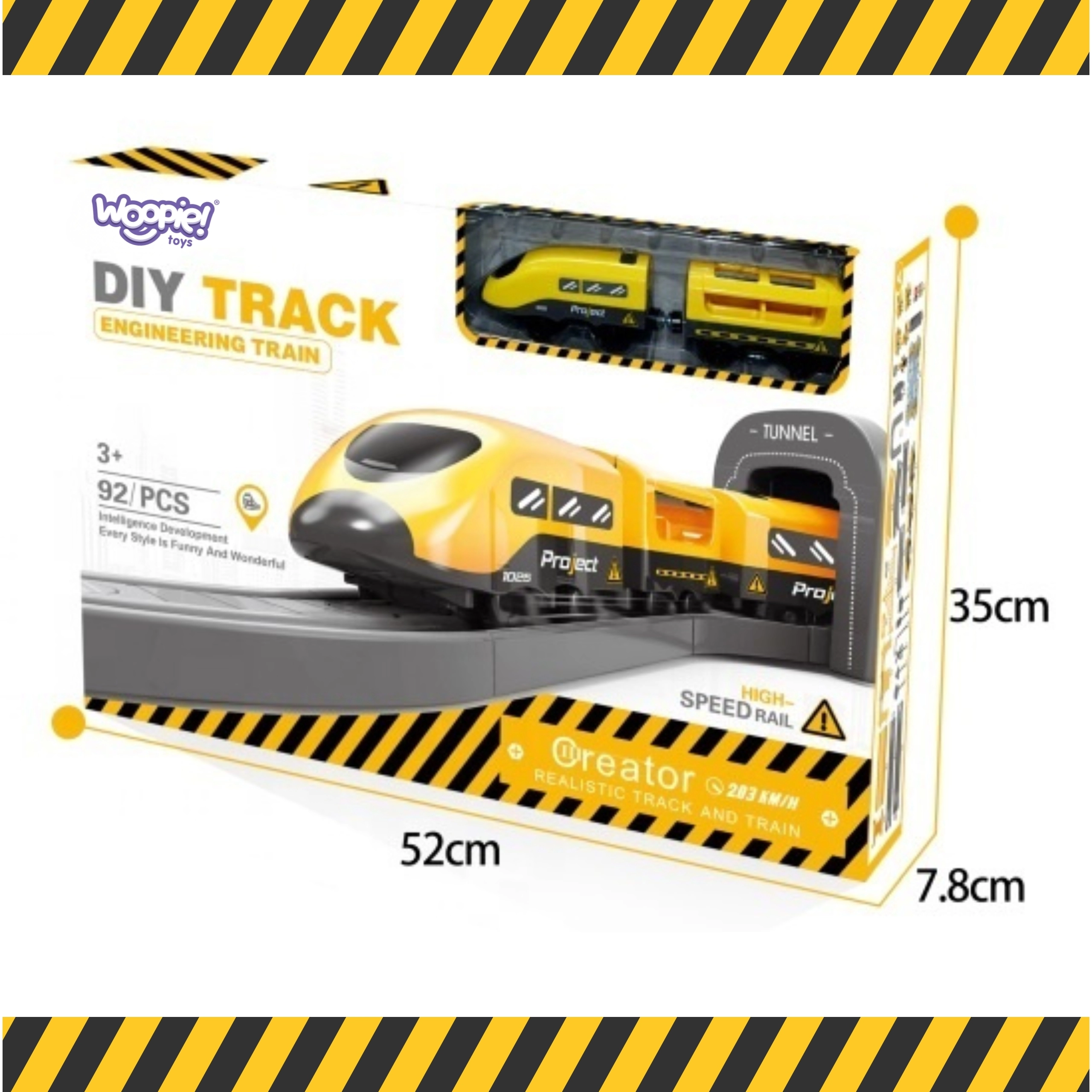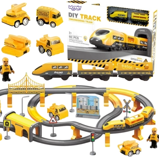 Oplev jernbanens kreative verden med WOOPIE-sættet, der kombinerer spændende togture med opbygning af spor og bymiljø. Den gule ekspres med elektrisk drift kører over broen og gennem tunnelen, passerer lyssignaler og trafikskilte – præcis som på en rigtig jernbane. Et af sporets elementer udløser ved passage autentiske lydeffekter, der forstærker legeoplevelsen.