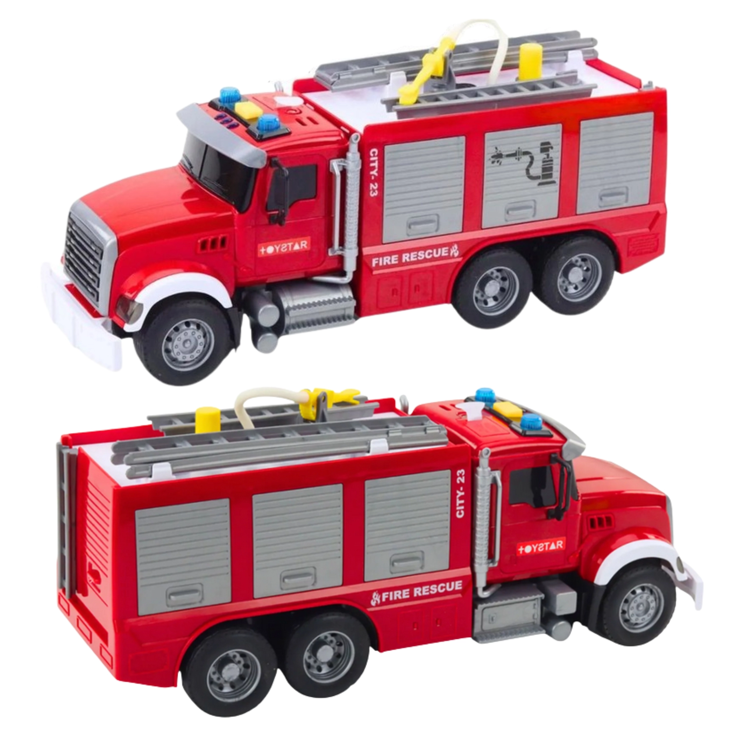 - Brandbil med vandspreder, vandtank, fleksibel slange med mundstykke, knap/pumpe til pumpning, interaktive knapper til lys og lyd