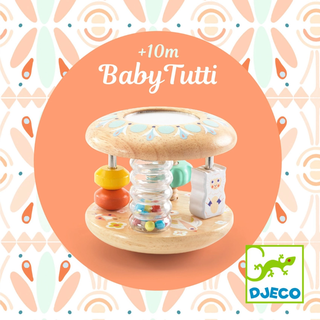 Baby Tutti er et gennemtænkt trælegetøj, der er let at gribe, rasler behageligt og ruller, når det lægges ned. Børn fascineres af de farvede perler i det gennemsigtige rør, det lille spejl til de første opdagelser og skydbare ringe på stavene. Legetøjet understøtter hånd-øje-koordination og motiverer til at kravle og vende sig.