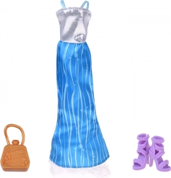Lang blå kjole med sølvfarvet overdel, lilla sandaler, halskæde og håndtaske – et komplet outfit til det kongelige bal.