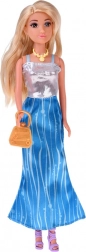 Aftenkjolen er inspireret af vandoverfladen – den sølvskinnende overdel minder om solglimt, og den lange blå nederdel med bølgemønster vækker associationer til havets bølger. Looket fuldendes af hæle, halskæde og håndtaske, så prinsessen eller havfruen altid er klar til bal eller undervandseventyr.