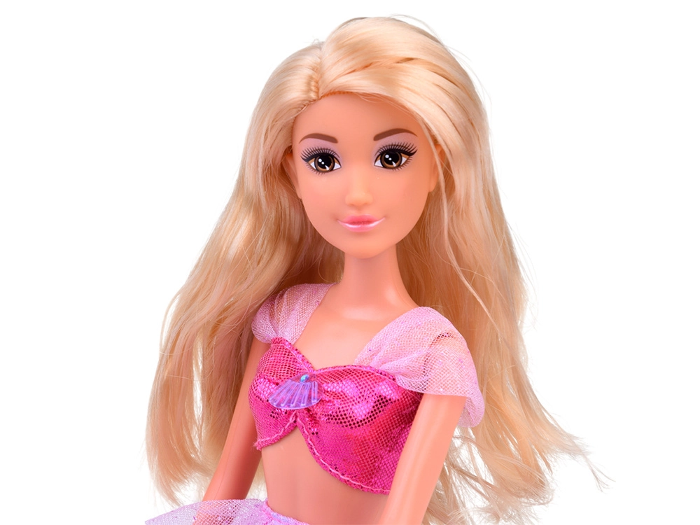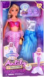 Anlily-dukken fortryller med et blidt smil, store brune øjne og langt blond hår, perfekt til at rede og skabe frisurer. I æsken finder du alt til to looks: prinsessens aftenkjole og havfrueoutfit med glitrende crop top og stofhale med gennemsigtige finner.