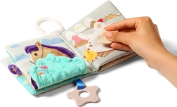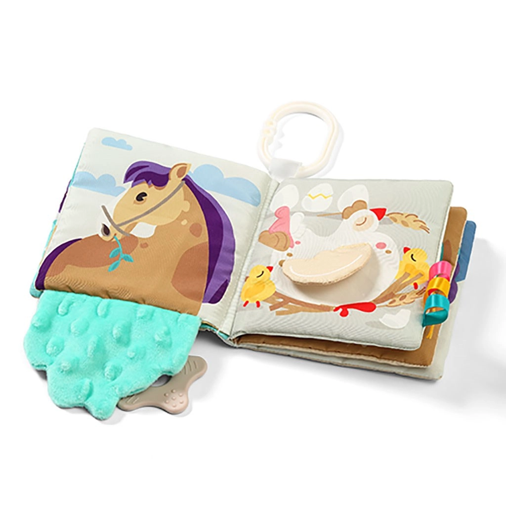 Blød stofbog til børn med gårdtema, der understøtter tidlig sanseudvikling og finmotorik. Den byder på kontrastfarver, forskellige teksturer, knitrelyde og et bidelegetøj til massage af gummer. Takket være den praktiske ring kan den nemt fastgøres til barnevogn eller autostol – ideel til underholdning på farten.