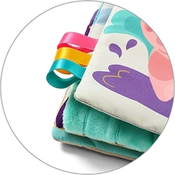 Takket være de kompakte mål og ophængsringen er bogen en perfekt ledsager både hjemme og på farten. Den hjælper med at træne greb, hånd–øje-koordination og koncentration samt udvikle fantasi og tidlig forståelse af farver, former og tal.