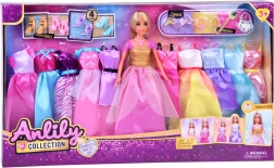 Dette charmerende sæt til små modeelskere indeholder alt, hvad der skal til for kreativ udklædning. Dukken ANLILY med langt hår og detaljeret makeup kan klædes i 11 forskellige kjoler – glitrende, med tyl, mønstrede og enkle, korte og lange. Det rige sæt af tilbehør (kroner, halskæder, håndtaske, scepter og farverige stiletter) giver hver styling et unikt touch.