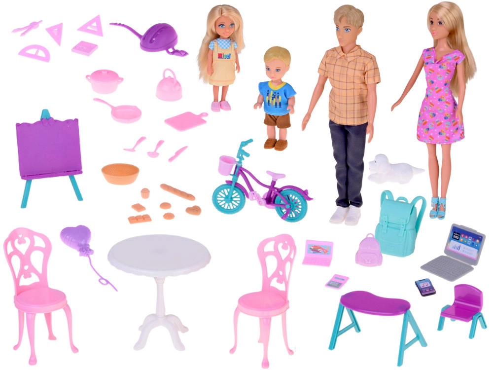Legescenerne skifter flydende mellem hjem, skole og arbejde: lav lækkerier i køkkenet, fyld energi ved bordet, prøv undervisning ved pulten med laptop og lommeregner, eller nyd bevægelse udenfor på cykel med hjelm. Takket være dukkernes bevægelige lemmer og det farverige tilbehør er legen naturligt varieret og langtidsholdbar sjov.