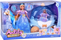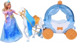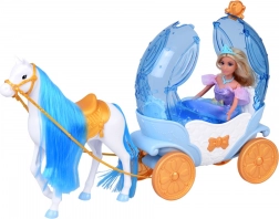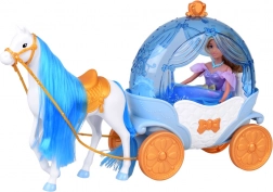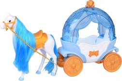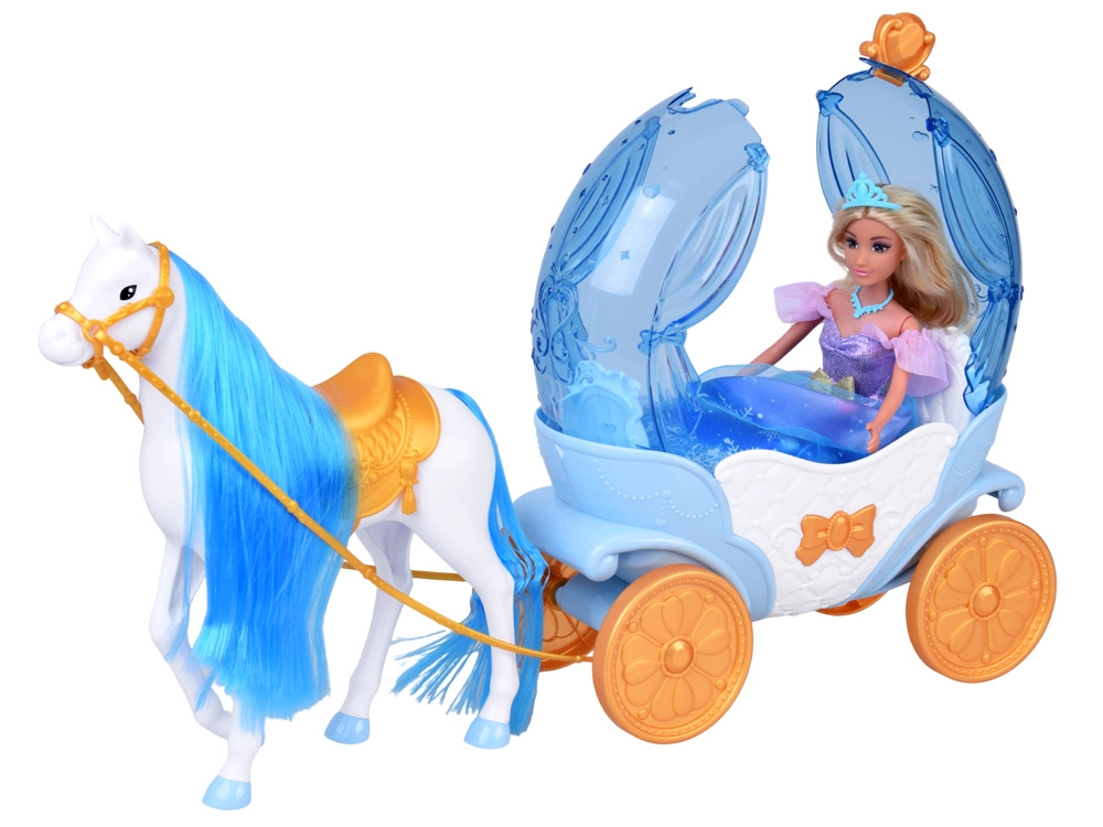 “Græskar”‑kareten i blå‑hvid med gyldne accenter har en åbningsbar topdel, så dukken nemt kan placeres indeni. Den hvide hest med blå man er udstyret med saddel, trense og seletøj, og kareten har bevægelige hjul for en glat kørsel på gulvet.