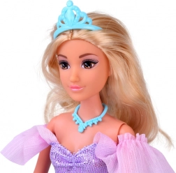 Denne elegante prinsesse i en lang kjole i toner af blå, lilla og rosa med skinnende detaljer og gylden sløjfe fortryller ved første blik. Takket være det lange blonde hår, tiara og halskæde kan børn nyde at rede, klæde på og finde på deres egne eventyrscener.