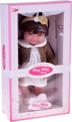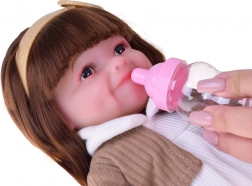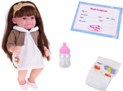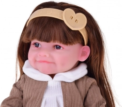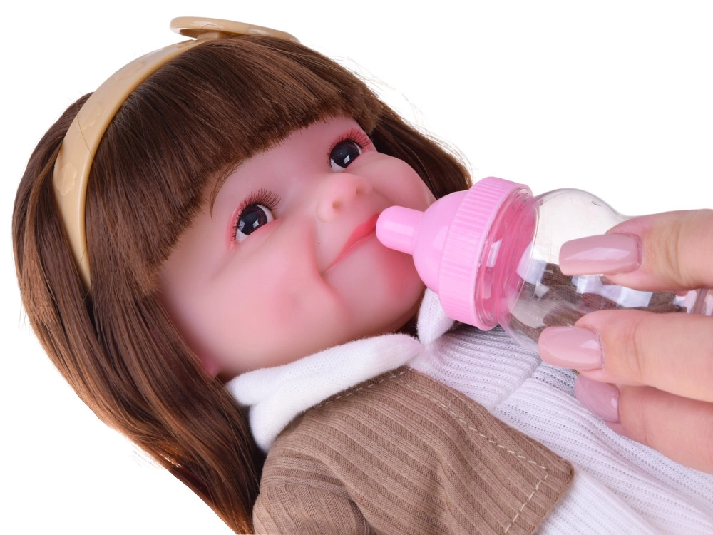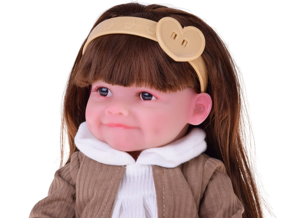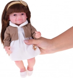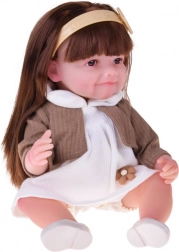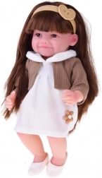 Dukken Tosia med et mildt smil og langt brunt hår vil glæde ethvert barn. Hun har en blød, behagelig krop, bevægelige lemmer og kan sidde selv. Med følger flasketilbehør, ble og fødselsattest til realistisk rolleleg. Det stilfulde outfit består af en hvid kjole, beige cardigan, hårbøjle og aftagelige ballerinasko.