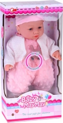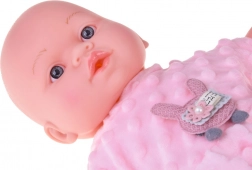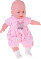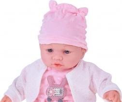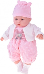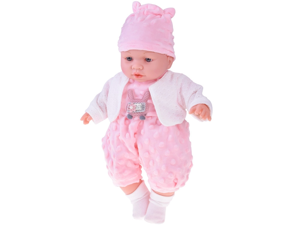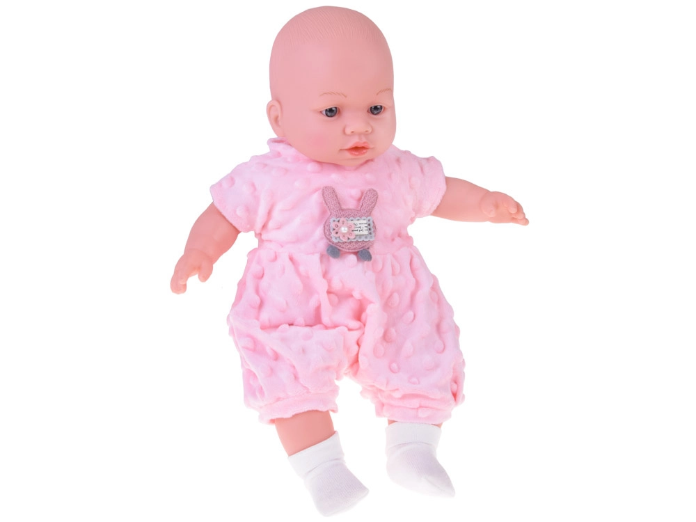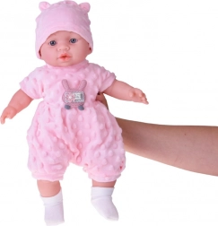 Den søde babydukke på 40 cm vil glæde hvert barn fra 12 måneder. Det bløde tekstilkorpus gør den perfekt at kramme, let at bære og har realistiske ansigtstræk. Ved tryk på maven afgiver den forskellige lyde – pludren, latter, pivgråd og murren. Medfølger gør en blød lyserød minky-romper med applikation, hu e med ører, hvid cardigan og sokker.