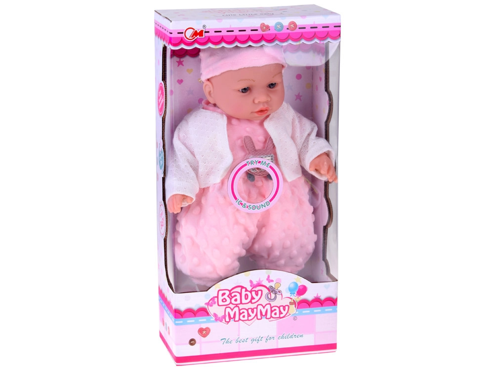 Lydmodulet er skjult i maven – ved tryk høres en blanding af lyde, som børn elsker: pludren, latter, murren og gråd. Dukken har hverken hår eller små dele og er derfor sikker for de mindste. Batteri medfølger; fjern blot sikringen, så er legen i gang.