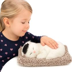 Den sovende hvide kat med brun-sorte pletter virker utroligt realistisk og skaber straks en hyggelig atmosfære i rummet. Den bløde, pelslignende overflade indbyder til at blive nusset, og de blide miavelyde gør dyret til en beroligende ledsager for børn.