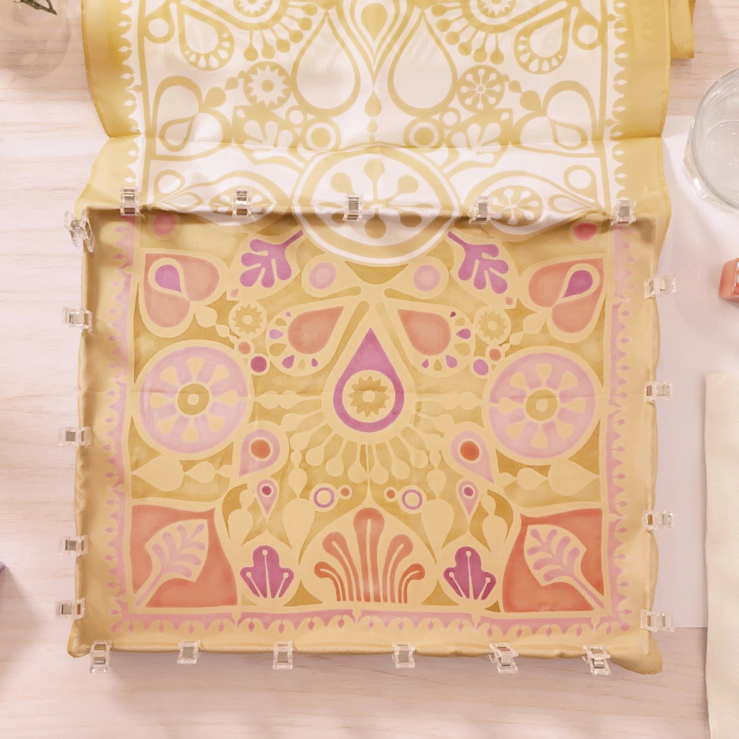 - Silketørklæde, tekstilfarver, 2 pensler, klips til fastgørelse, skål til farve, skabelon/motiv