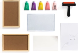 Et praktisk sammensat sæt med gelplade, rulle, fem farver og papirer gør det muligt at begynde at skabe straks efter udpakning.