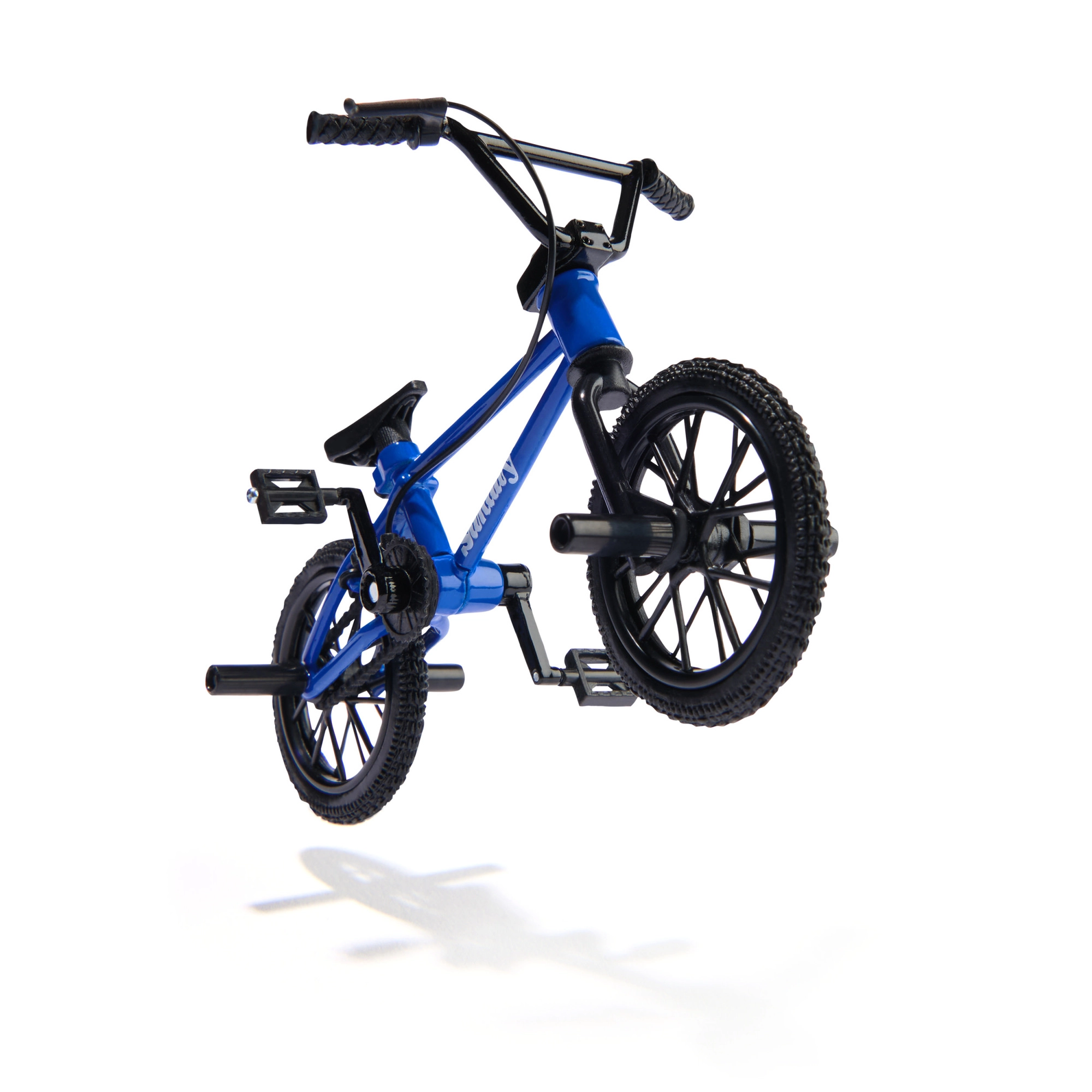 Den blå finger-BMX SUNDAY med detaljeret ramme, eger, pedaler og pegs gør det muligt at træne freestyle-tricks direkte på bordet.