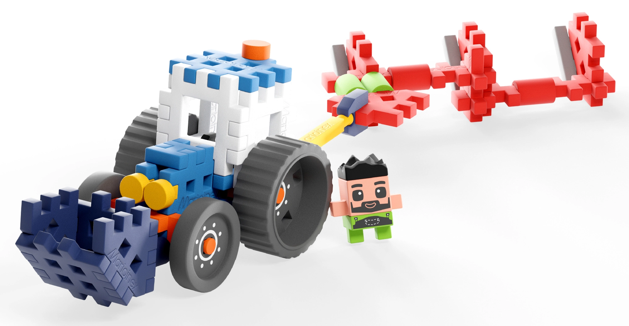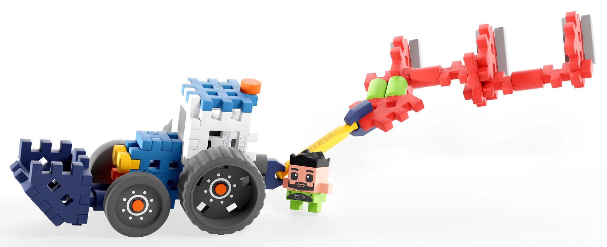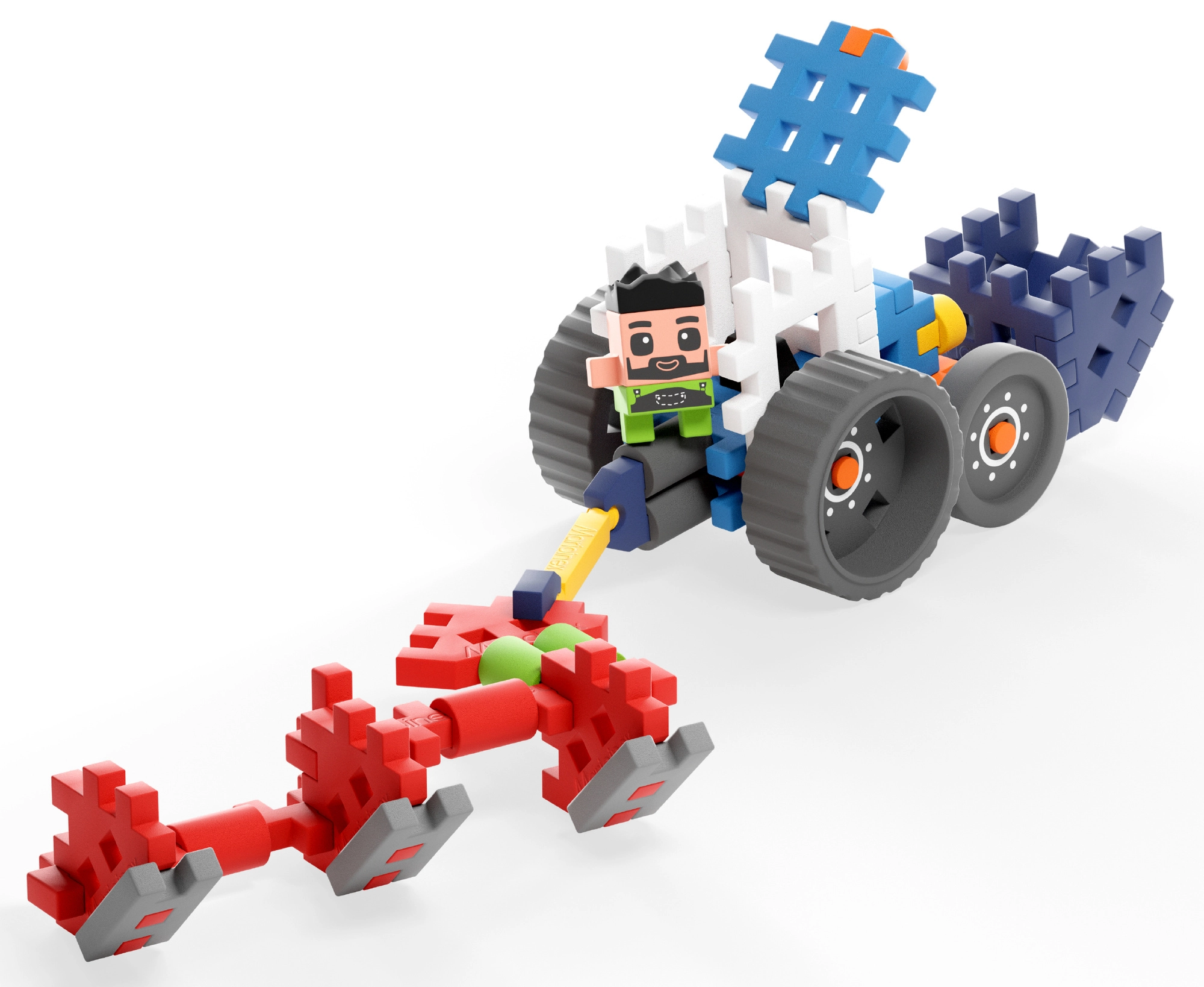 Der medfølger også en bonde-figur, som beriger legeoplevelsen med rollelege. Børnene træner kreativitet, manuel kunnen og logisk tænkning, mens de har det sjovt med den kørende traktor og den tilkoblede plov.