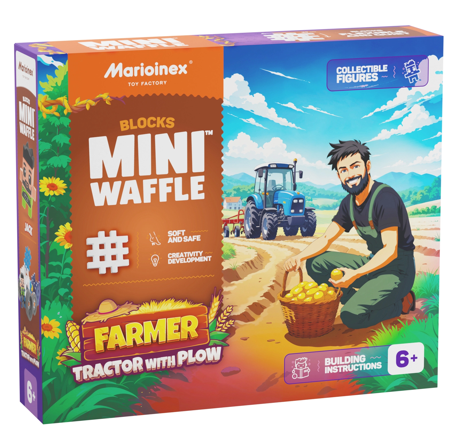 Byggesættet MINI WAFFLE FARMER – Traktor med plov tager børn med ind i hverdagens arbejde på marken. Byg en realistisk traktor med funktionelt plov-tilbehør, brug fantasien, og skab dine egne historier fra bondegårdens liv. De fleksible dele gør byggeriet intuitivt og behageligt, og den færdige model er klar til leg.