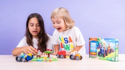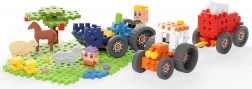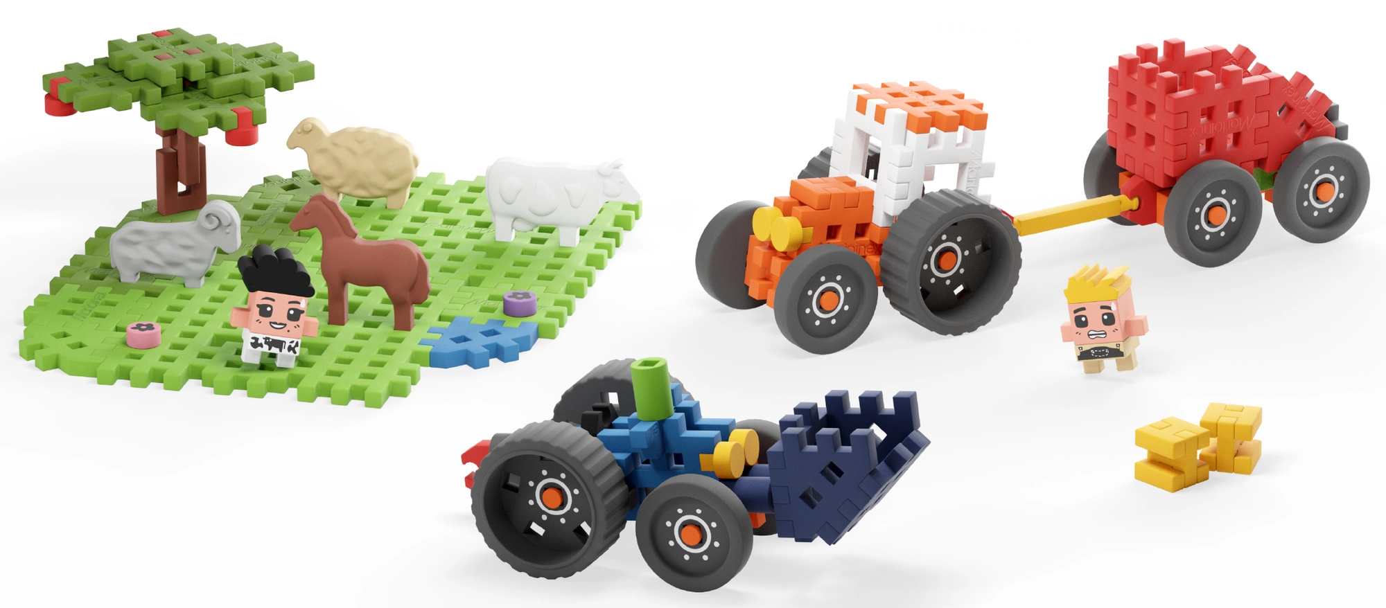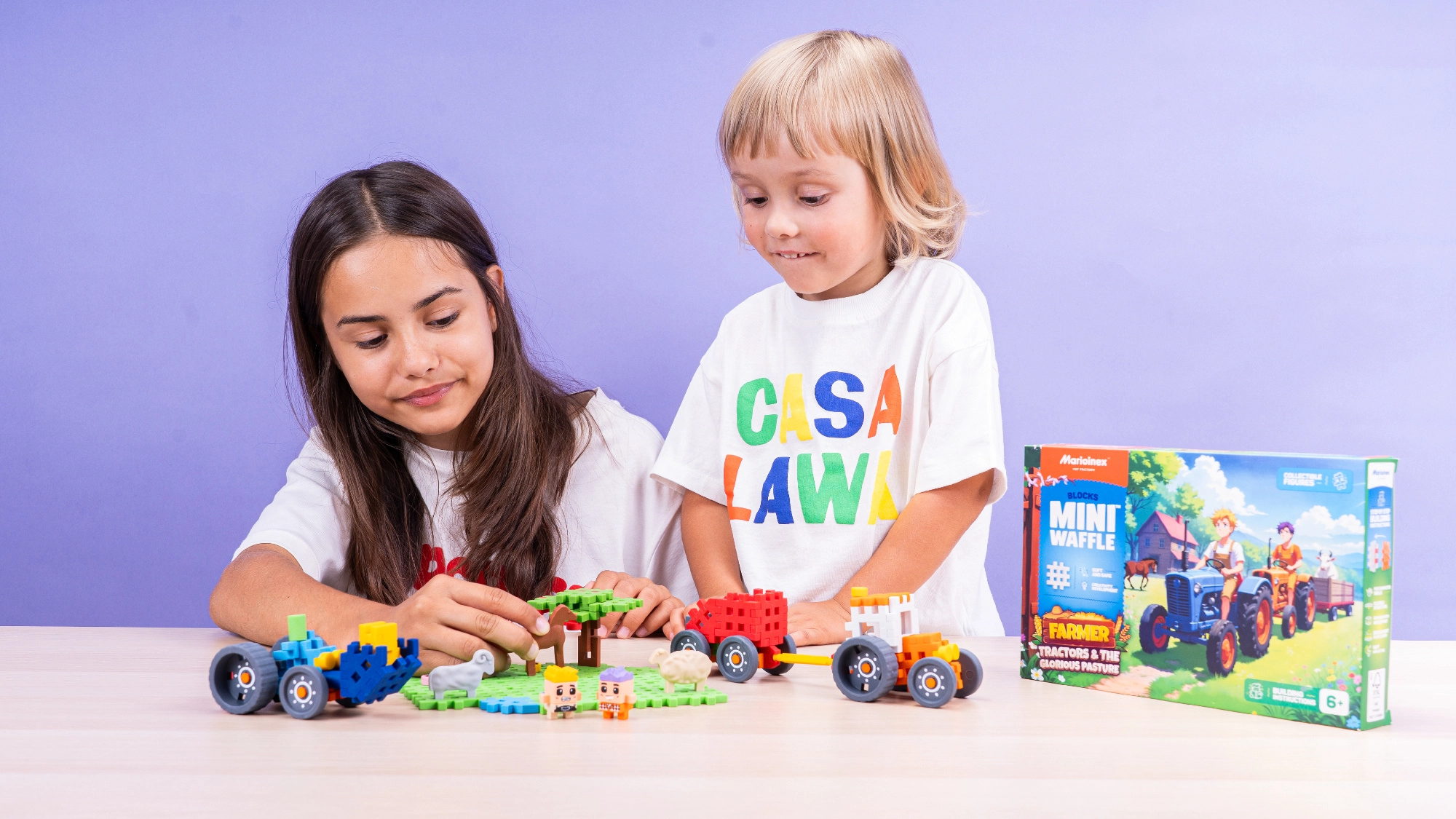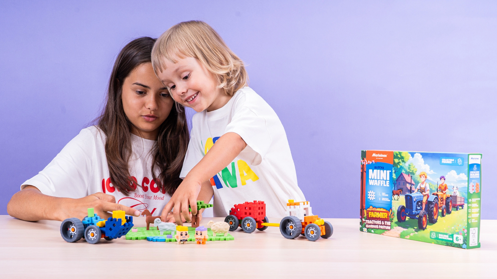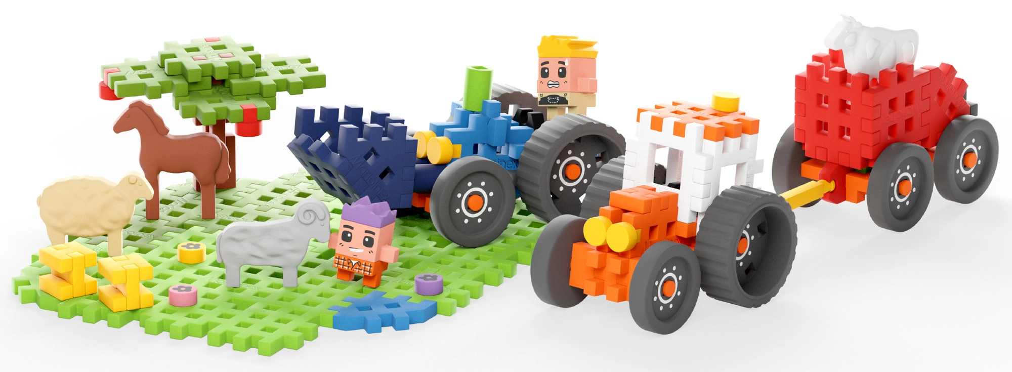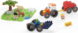 Sættet Marioinex Mini Waffle Farmer – Traktorer og eng er ideelt til små konstruktører og elskere af livet på landet. Af indholdet bygger I 2 køretøjer, et træ, en del af en græsgang, og der medfølger også figurer af personer og dyr. Delene er nemme at samle, behagelige at røre ved og fremstillet med fokus på bæredygtighed.