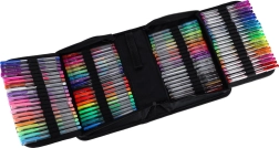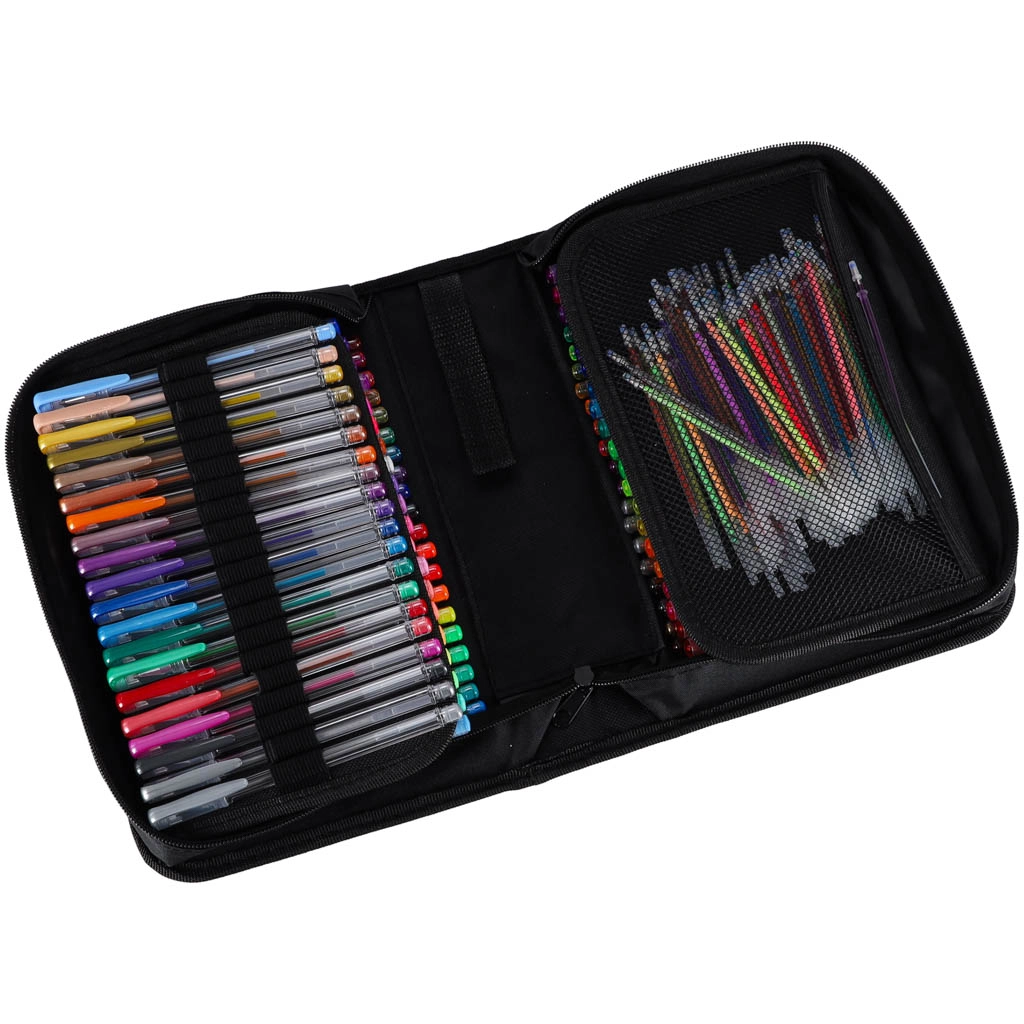 Oplev et alsidigt sæt til skole, kontor og fritid: 100 gelpenne i en rig palet af farver og effekter, plus 100 ekstra refiller. Det overskuelige foldbare etui med lynlås holder hver pen på sin plads, så du altid har alle farver ved hånden og sikkert opbevaret.