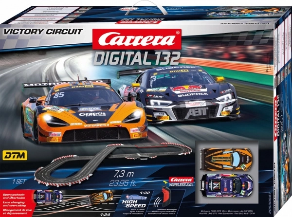 Oplev realistiske løb med CARRERA Digital 132 Victory Circuit bilbane på 7,3 m med to detaljerede biler MCLAREN 720S GT3 og AUDI R8 LMS GT3. Systemet muliggør kørsel af op til 6 biler på én bane, overhalinger på både lige stræk og i sving og tilbyder trådløse controllere, lyseffekter og forbindelse til app på smartenheder. Et godt valg for børn fra 8 år og voksne entusiaster.
