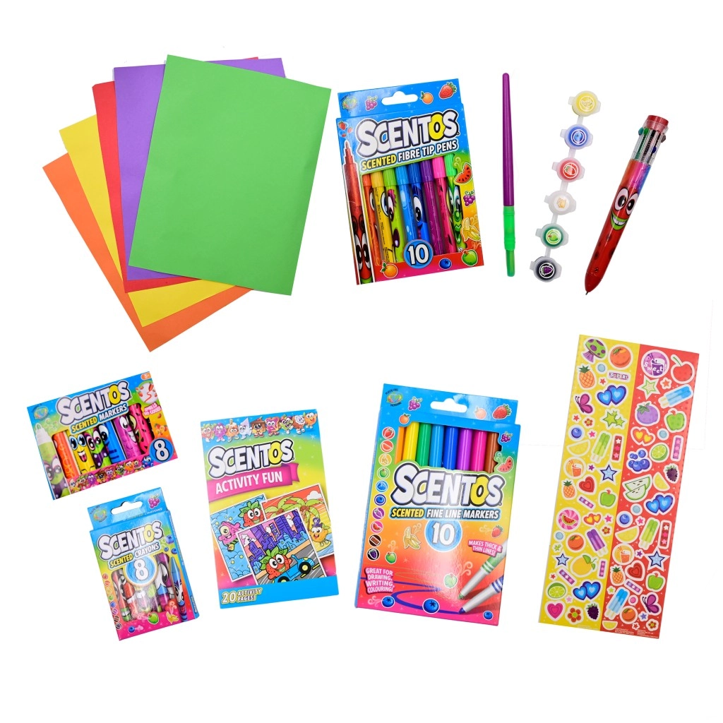 Oplev det duftende kreative sæt SCENTOS – mellem, som giver børn fra 3 år timevis af sjov og fantasifuld udvikling. Sættet indeholder duftende tuscher, farveblyanter, vokskrider og specialpenne med forskellige spidser til alsidige tegneteknikker. Der medfølger også tempera-farver med pensel, tematiske klistermærker og farvet papir. Ideelt til udvikling af finmotorik, sanseoplevelse og kreativitet.