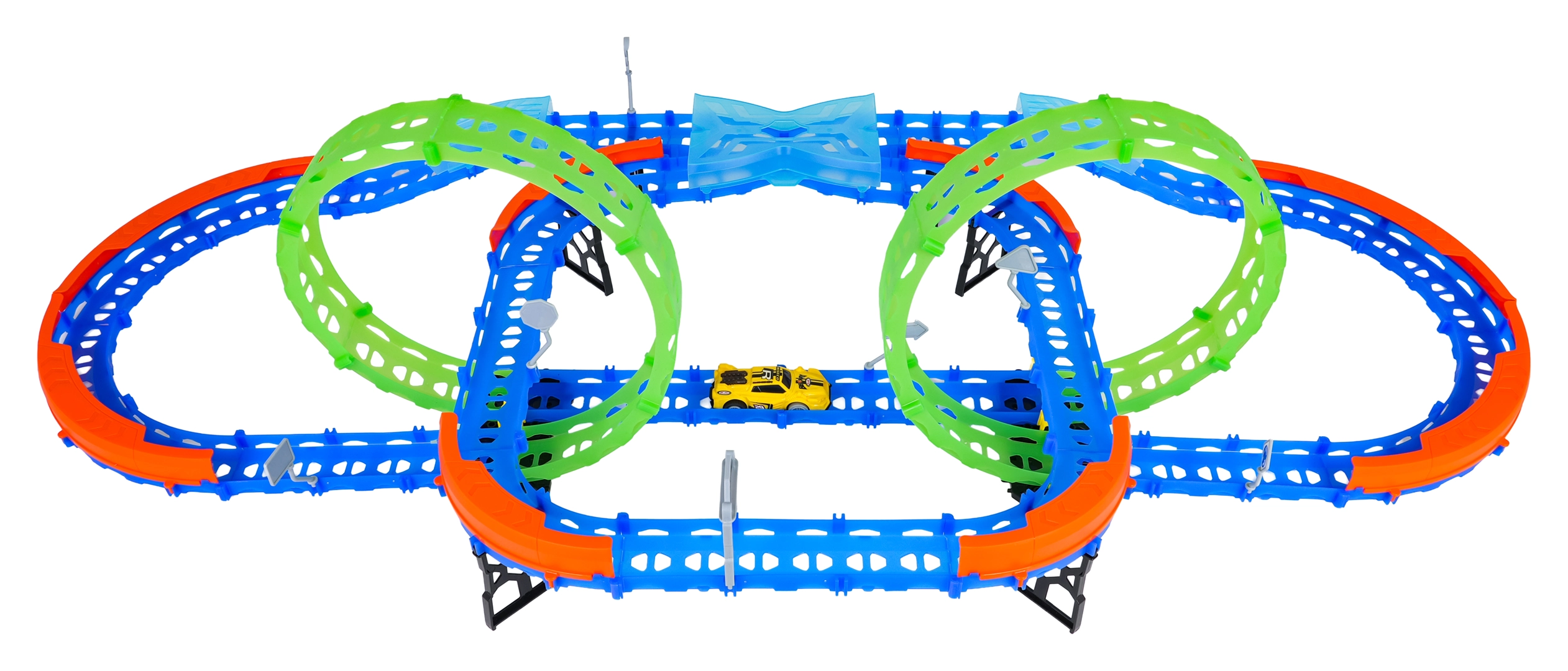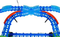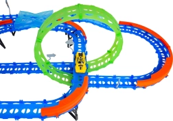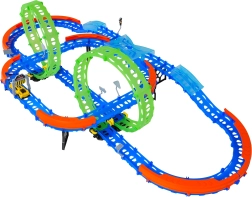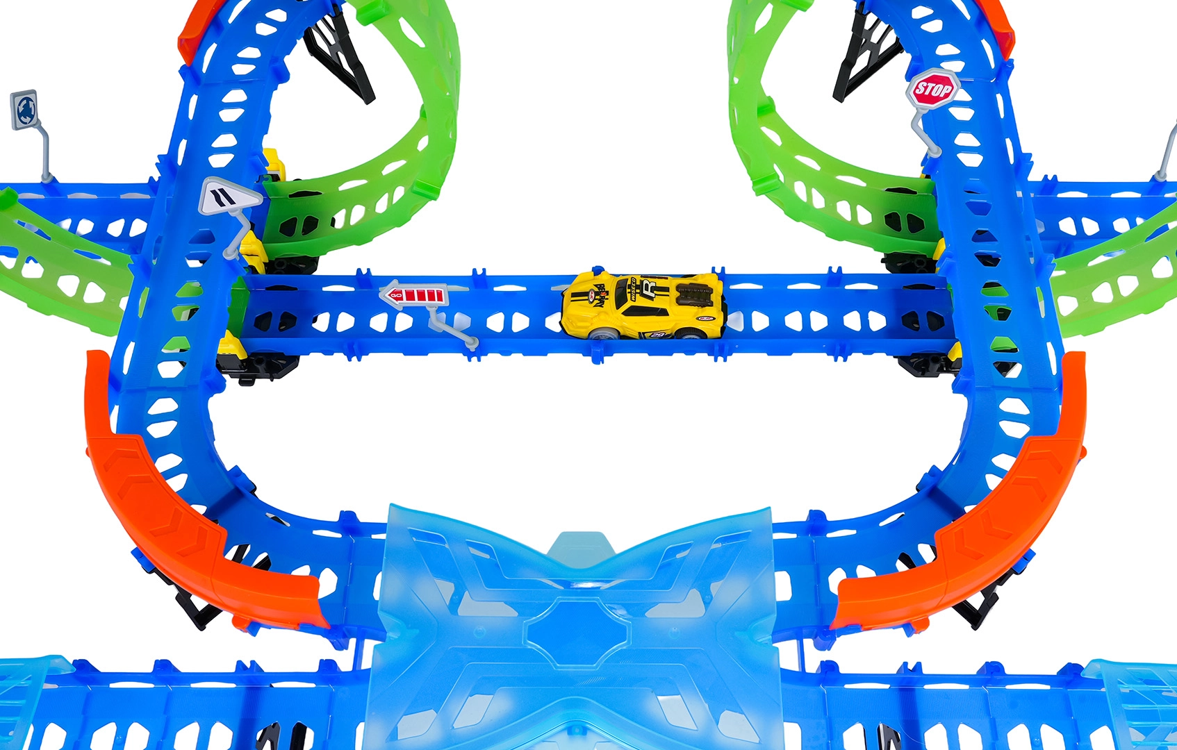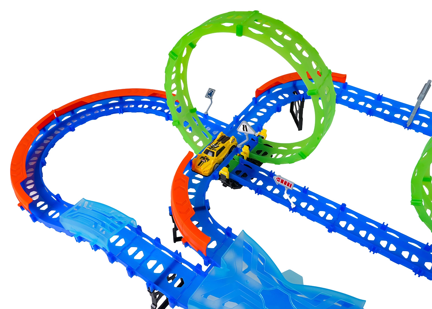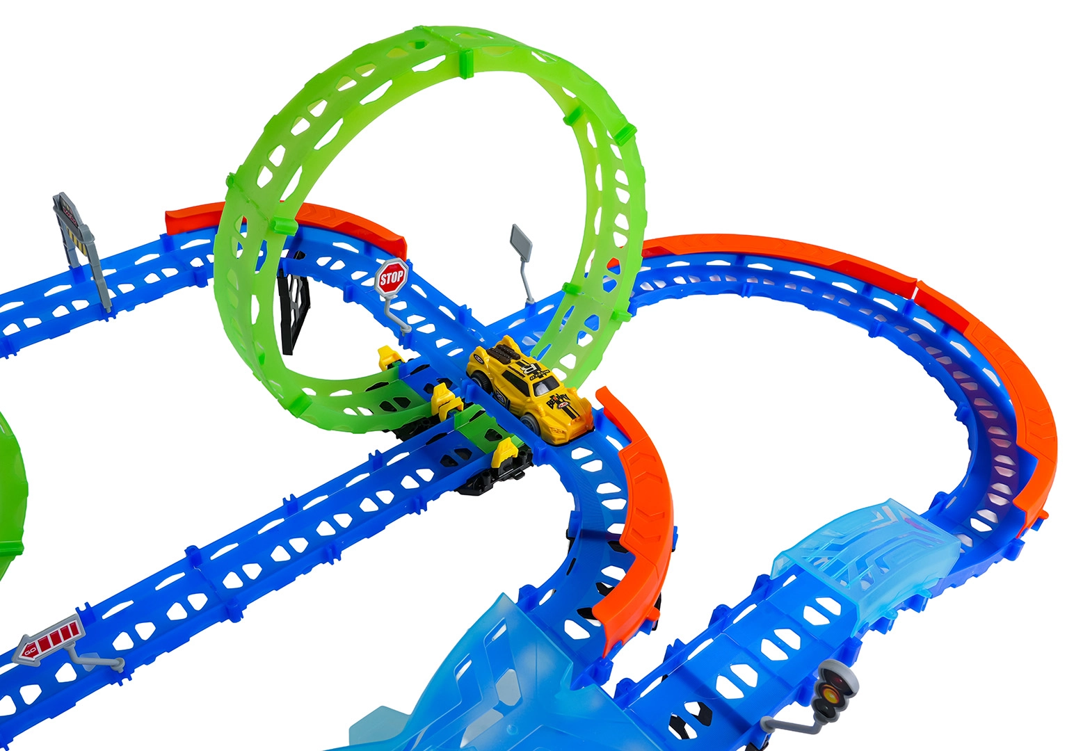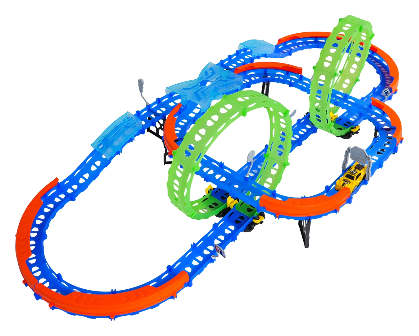 Byg en farverig bane med broer, sving og to loops, og se bilen suse afsted med høj fart. Fluorescerende elementer lyser op i mørket efter opladning med lys, så løbene bliver endnu mere actionfyldte og underholdende.