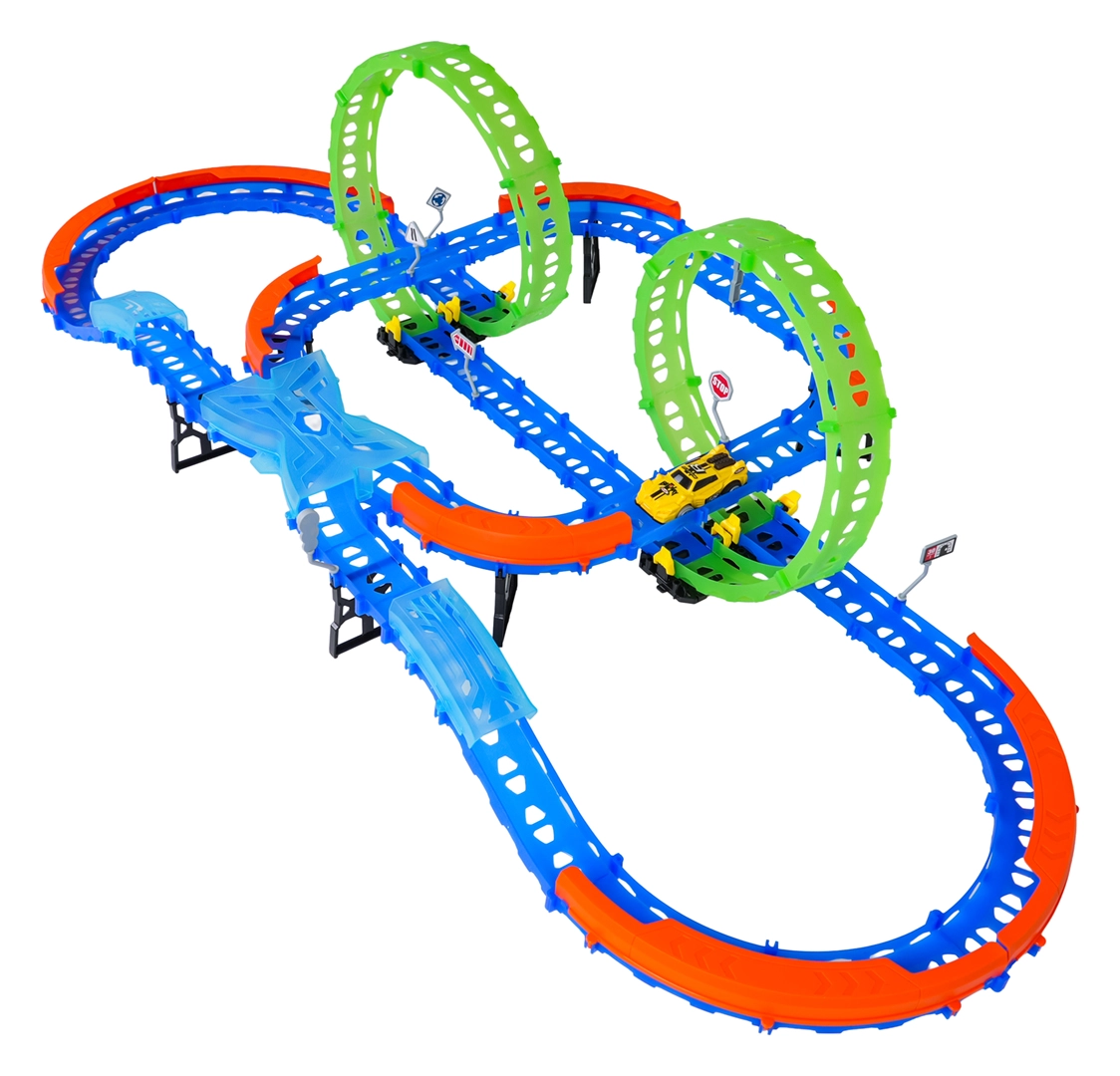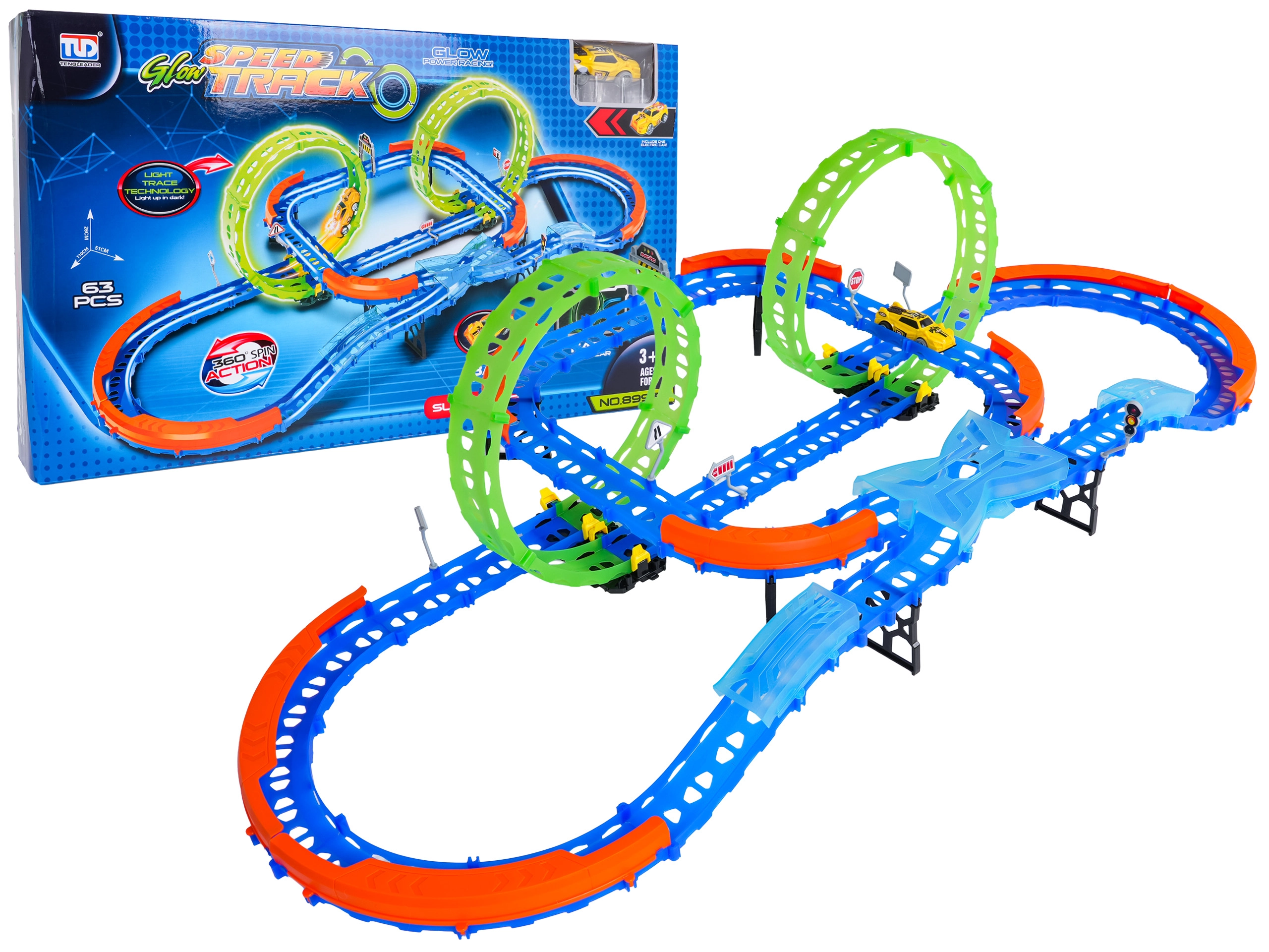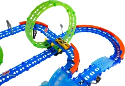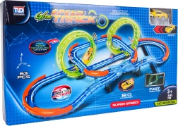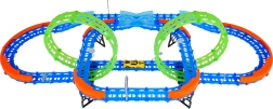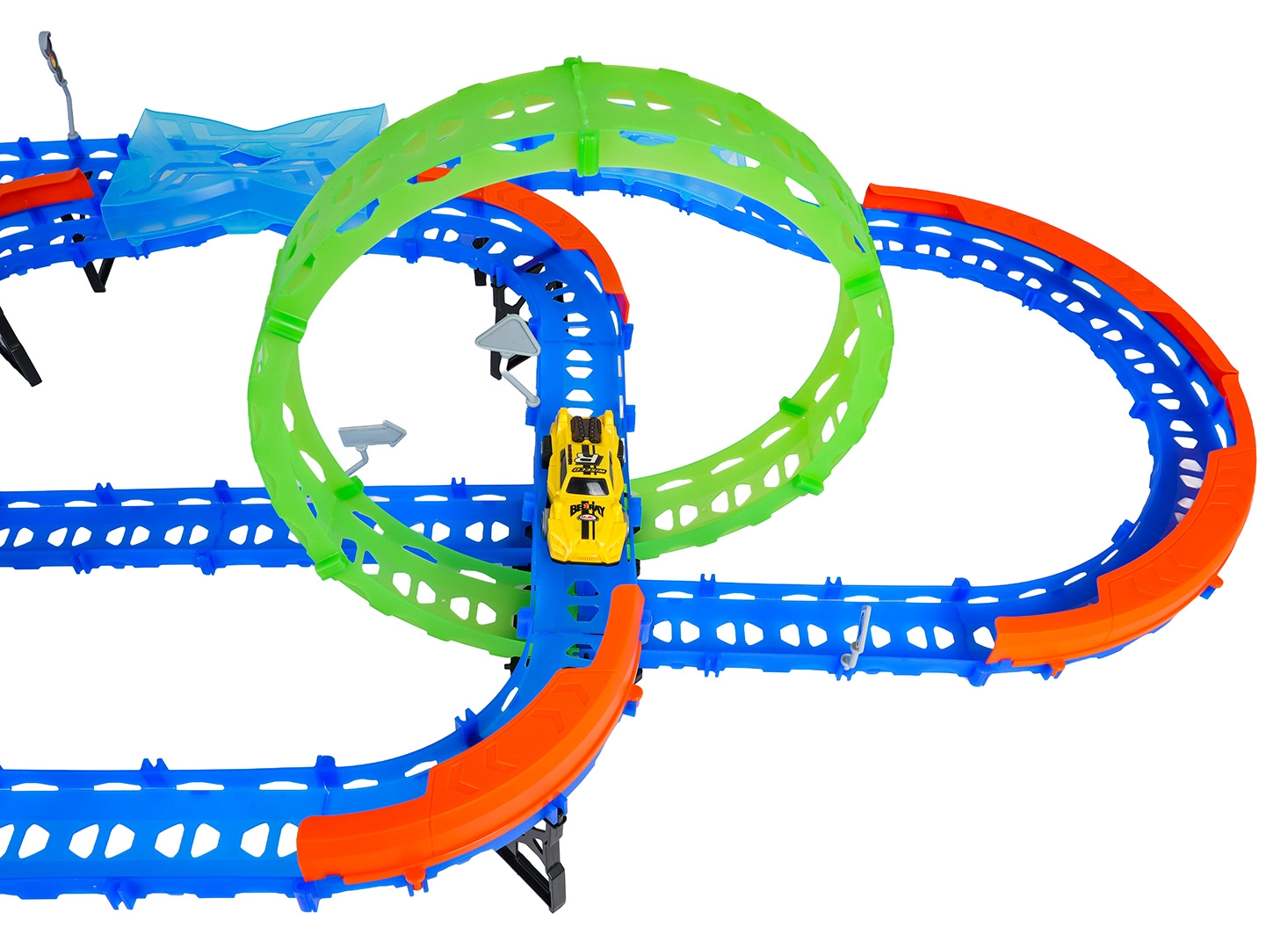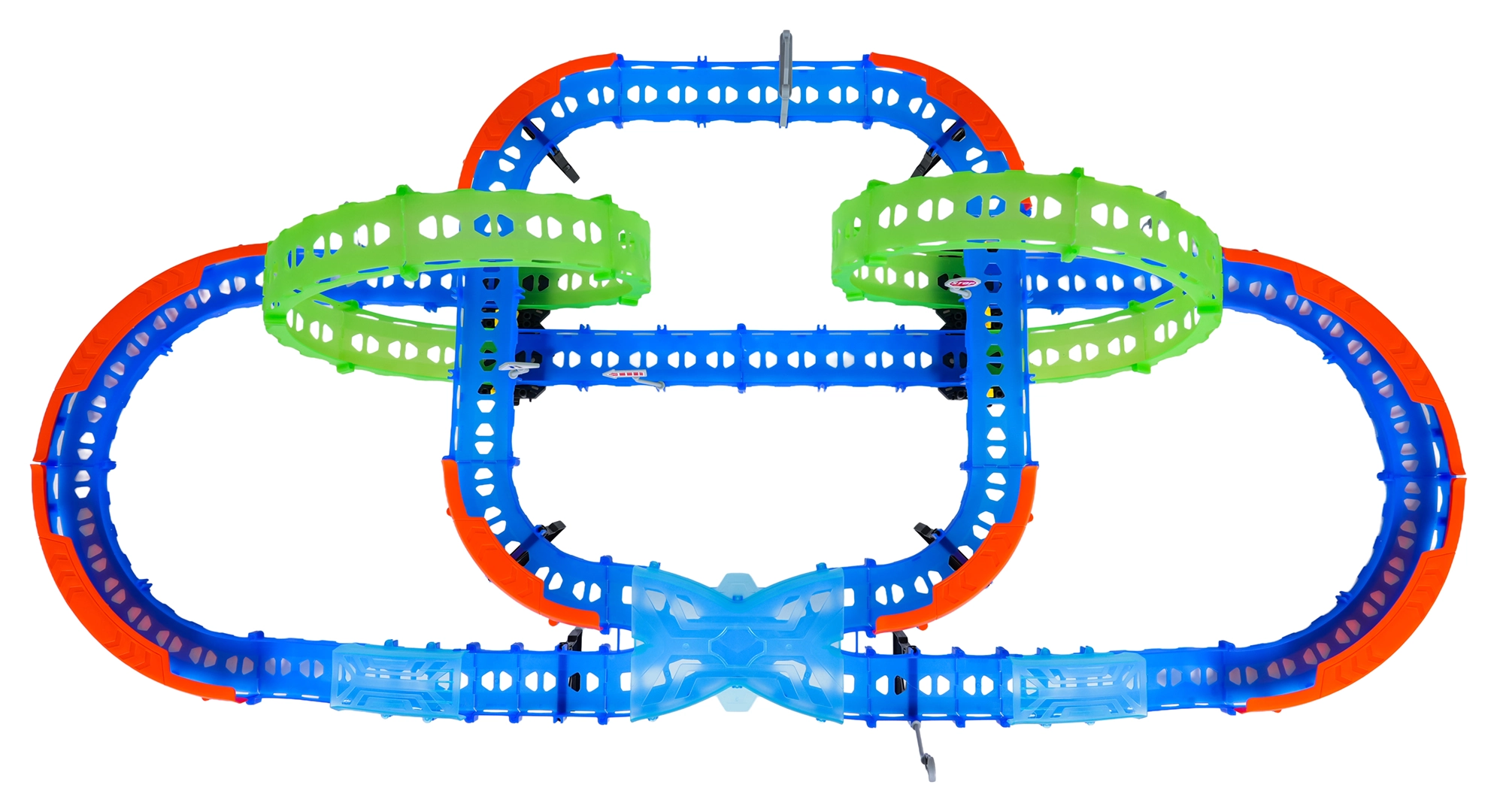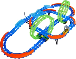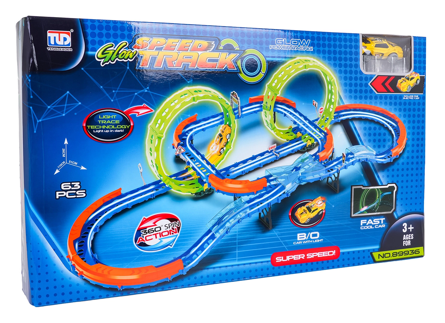 Byg en farverig bane med broer, sving og to loops, og se bilen suse afsted med høj fart. Fluorescerende elementer lyser op i mørket efter opladning med lys, så løbene bliver endnu mere actionfyldte og underholdende.