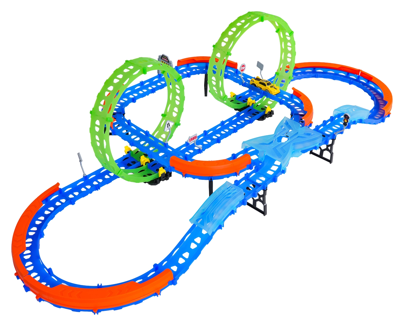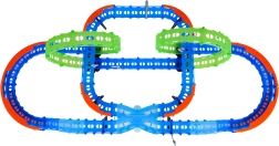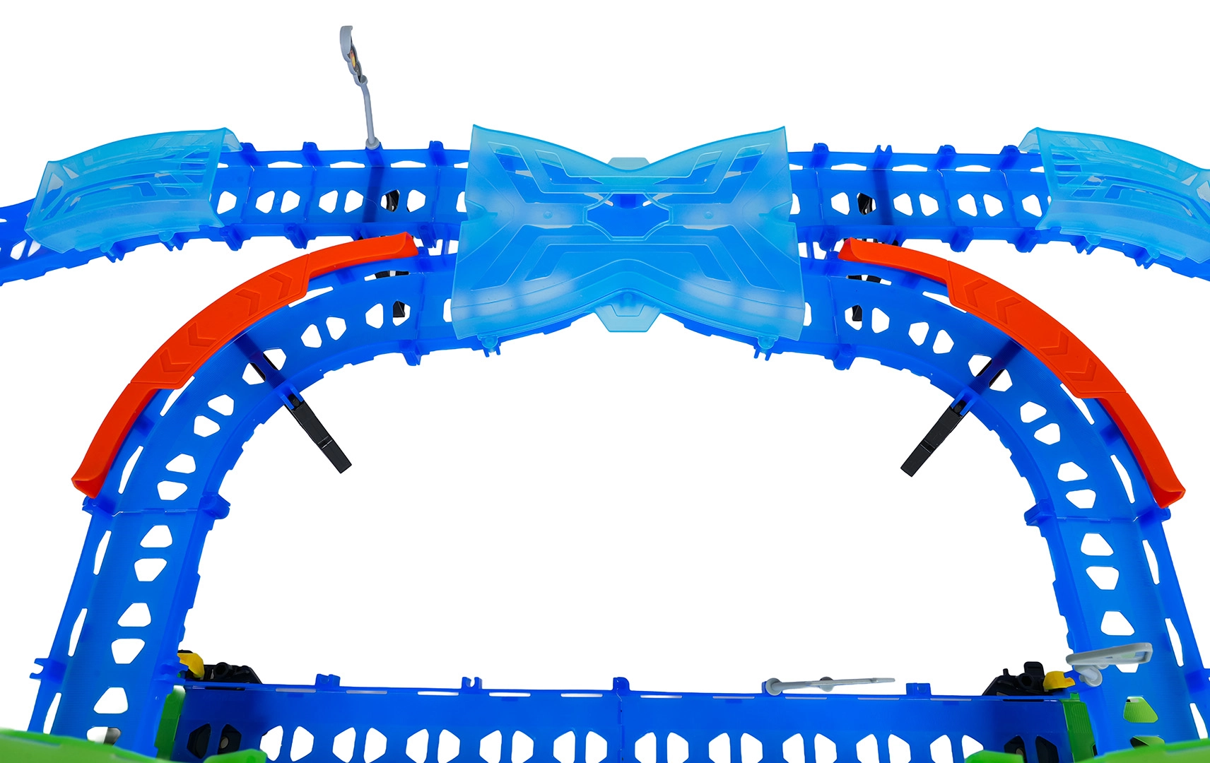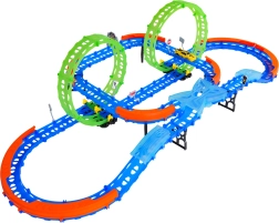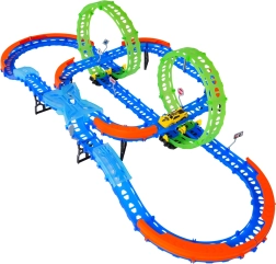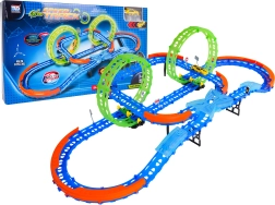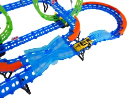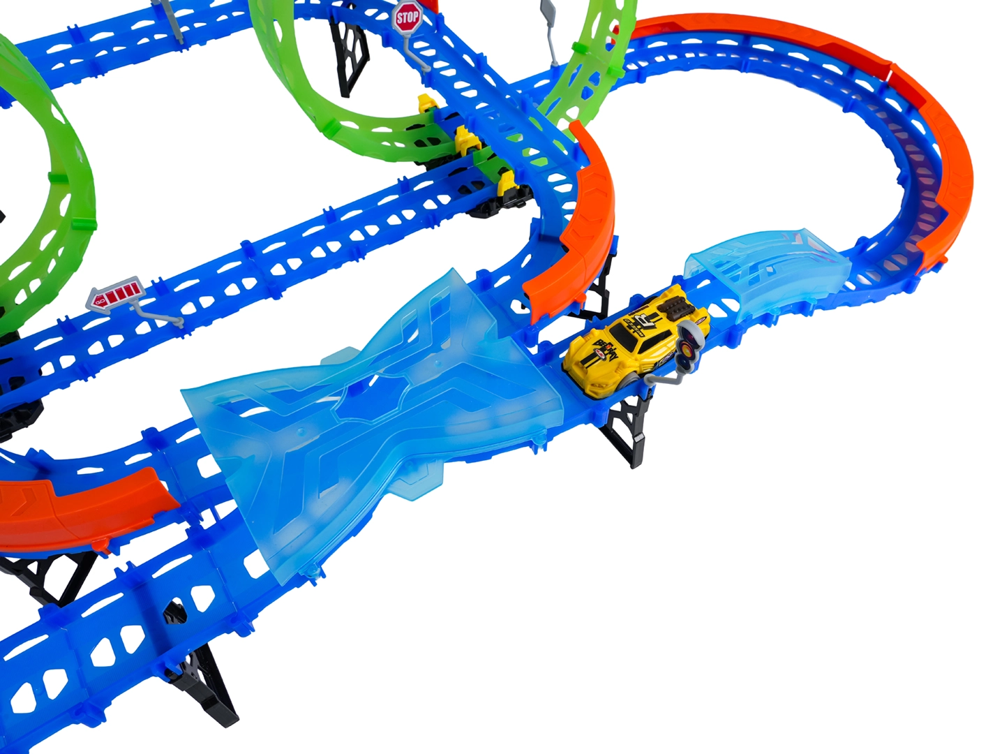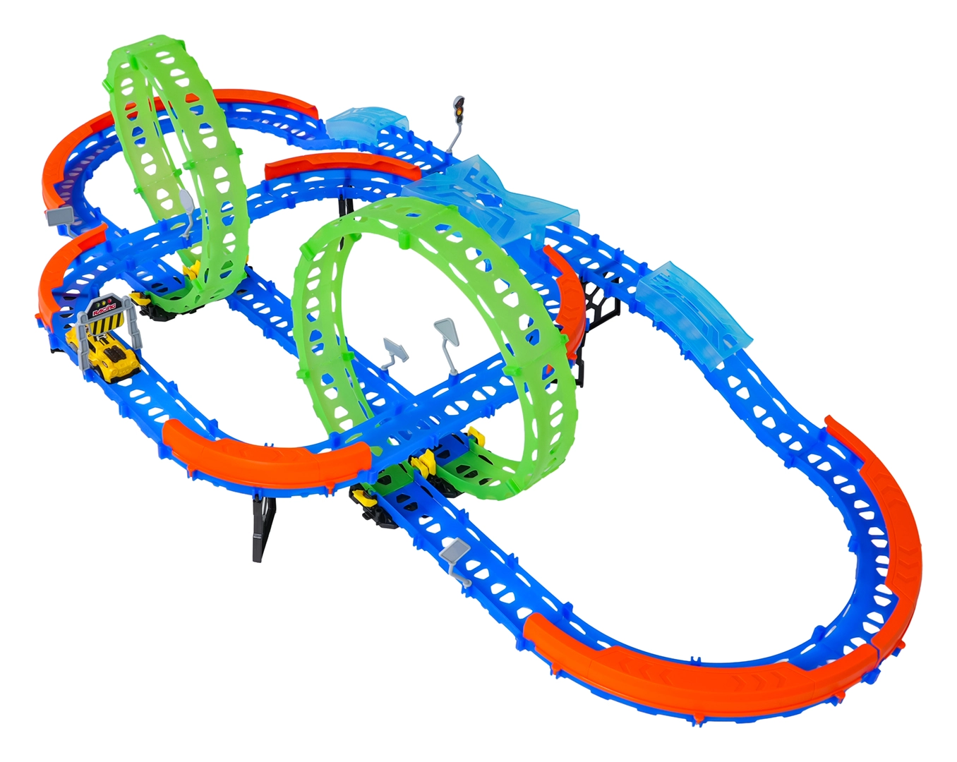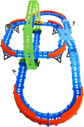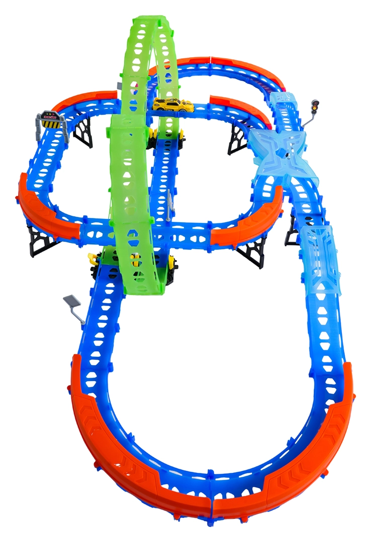 Byg en farverig bane med broer, sving og to loops, og se bilen suse afsted med høj fart. Fluorescerende elementer lyser op i mørket efter opladning med lys, så løbene bliver endnu mere actionfyldte og underholdende.