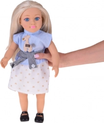Dukken er klædt i en elegant kombination – blå top med striber og applikation, smart bælte og en cremefarvet nederdel med gyldne motiver, der tilsammen danner et harmonisk outfit, fuldendt af sorte ballerinaer. Med bevægelige arme, ben og hoved kan dukken let sættes og arrangeres i forskellige positurer til små scener og historiefortælling.
