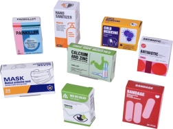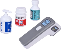 - Stetoskop med lyd, elektronisk termometer, sprøjte, saks, pincetter, otoskop, hammer, spejl, skål, infusion, blister med “tabletter”, æsker og flasker med “lægemidler”