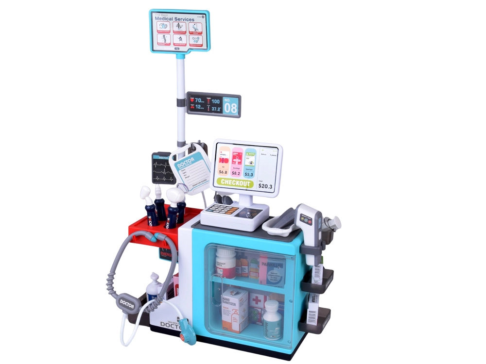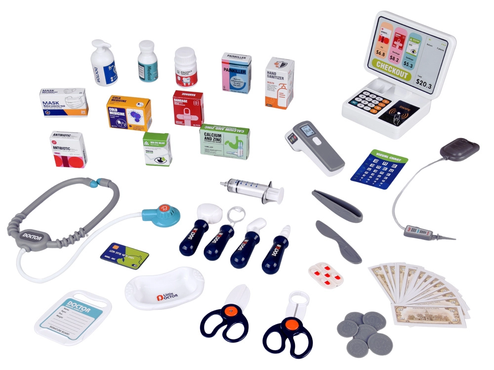 Indeholder kasseapparat med terminal (betaling med kort og “kontanter”), stetoskop med hjertelyd, elektronisk termometer samt en række lægeinstrumenter og æsker med “medicin”. Sættet udvikler kommunikation, finmotorik og grundlæggende finansiel forståelse.