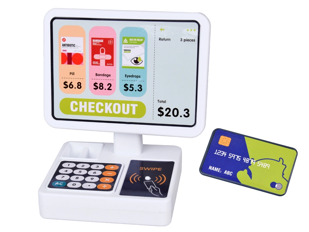 Børn kan øve betaling med kort og kontanter. Display, knapper og kortlæser suppleret med lyde giver legen et realistisk præg og sjov læring.
