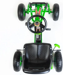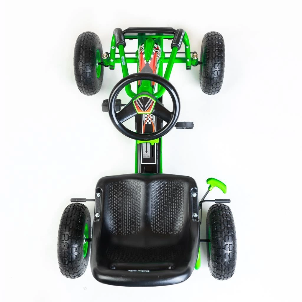 Gokarten er udstyret med kædetræk med mulighed for frakobling (friløb) og bakgear, så den er let at manøvrere selv på begrænset plads. Håndbremse på begge baghjul giver ekstra sikkerhed og kontrol, mens den holdbare metalramme og sportslige plastskærme tåler daglig leg.
