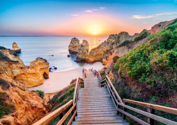 Oplev kystens magi med puslespillet DINO Praia do Camilo 2000 brikker. Det storformat motiv med trappen ned til den sandede bugt og dramatiske klipper i de varme farver fra solnedgangen skaber et billede, der vil tage sig godt ud i enhver indretning. Takket være den præcise udstansning og den højkvalitets karton passer brikkerne perfekt sammen, og samlingen er flydende og tilfredsstillende.