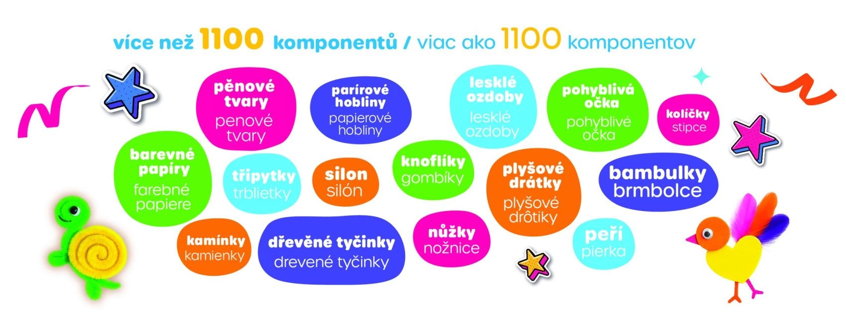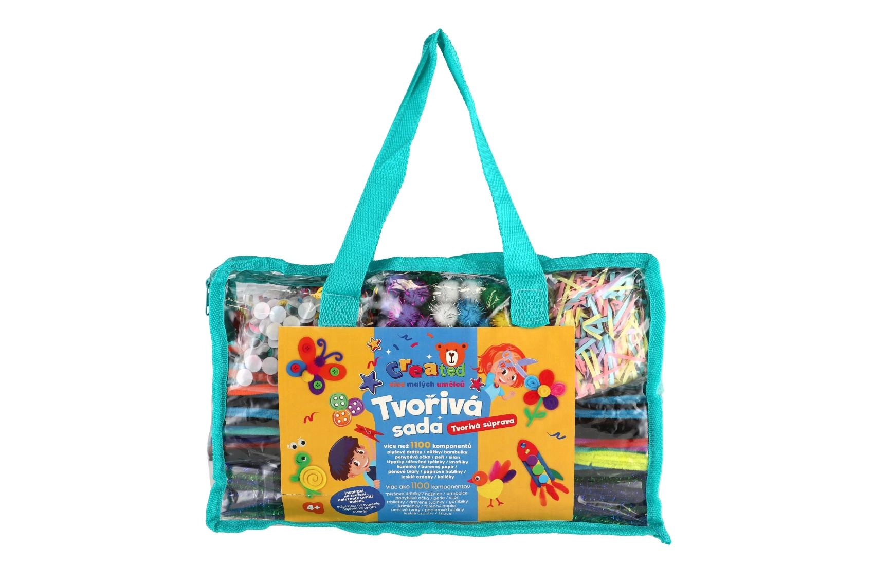 Dette farverige kreative sæt stimulerer børns fantasi og finmotorik. Takket være den rige kombination af komponenter – såsom piberensere, pomponer, skumformer, perler, fjer og klistermærker – kan børn lave både simple og mere avancerede projekter efter humør.