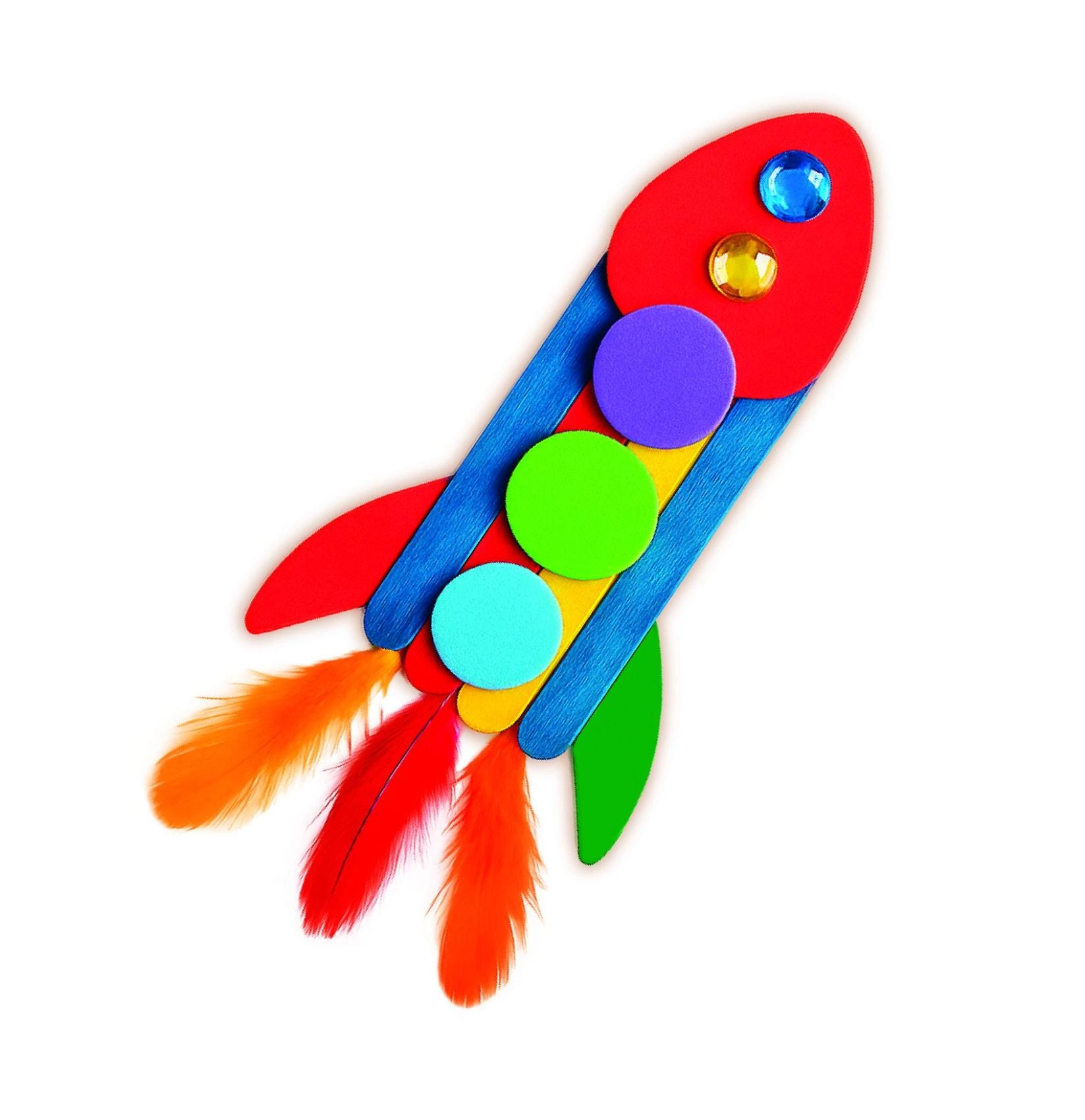 Børn kan lave deres egen raket og andre temakreationer. Kombinationen af former og pynt stimulerer kreativ leg og trinvis skaben.