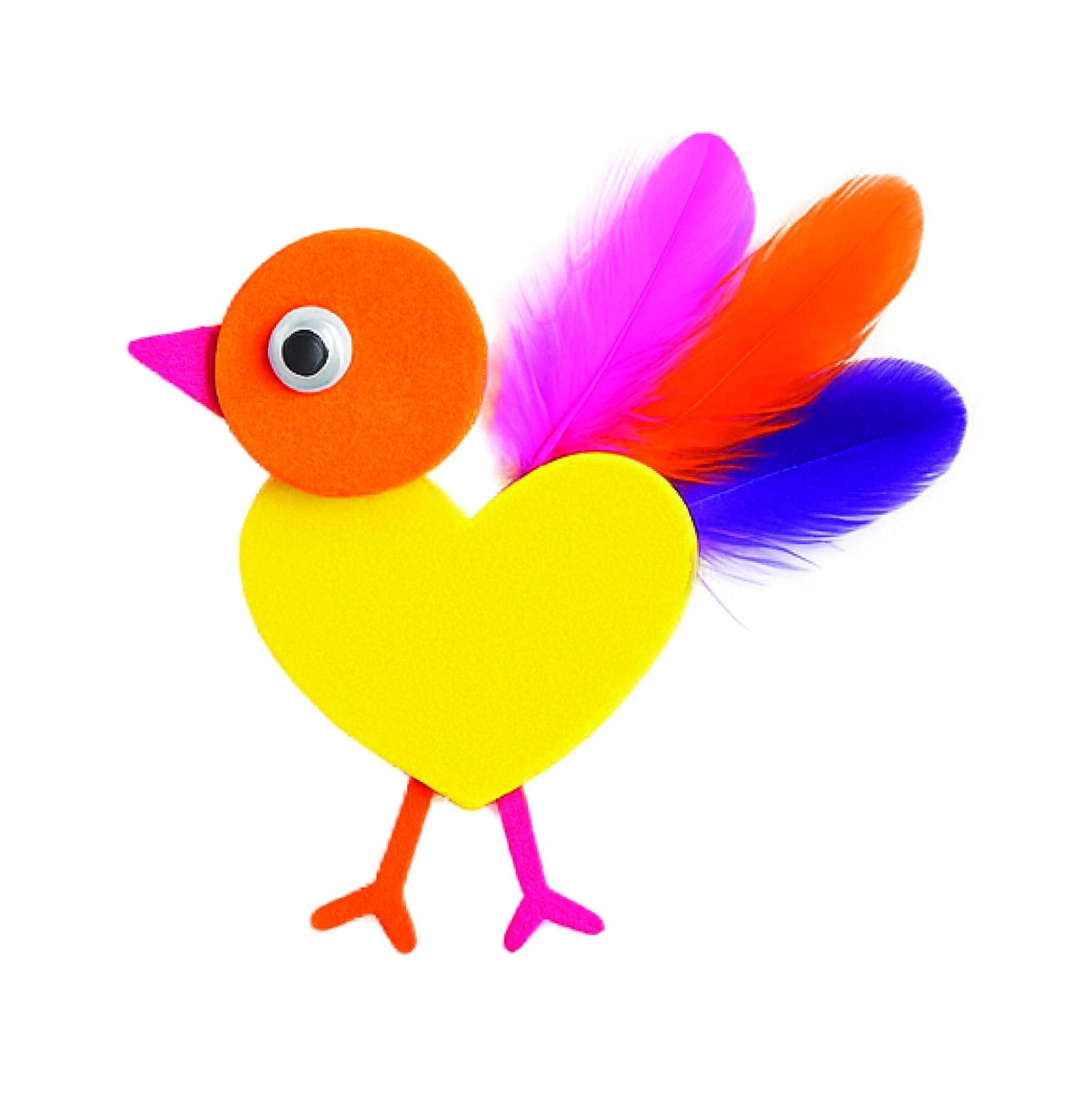 Med farverige skumformer og små fjer bliver det let at lave glade fugle, sommerfugle og andre figurer – ideelt til at styrke finmotorik og tålmodighed.