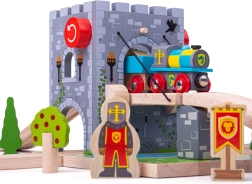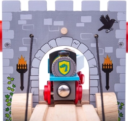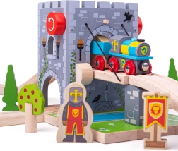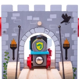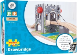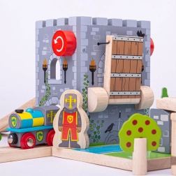 Skab en middelalderfæstning på banen! BIGJIGS RAIL træ-faldgitterbro med funktionelt spil lader børn hæve broen, standse toget og arrangere ridderlige eventyr. Realistisk stenmur, våbenskjolde, fakler og en bro over en “vand”-grav stimulerer fantasien og temalegen.