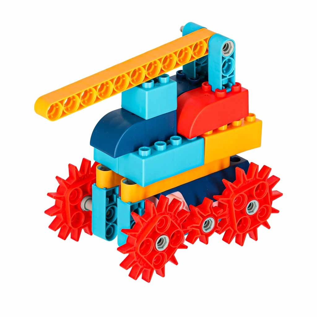 Tandhjul i forskellige størrelser, aksler og koblinger muliggør udveksling og rotation. Børnene afprøver i praksis principperne for mekanik og bevægelsesoverførsel.