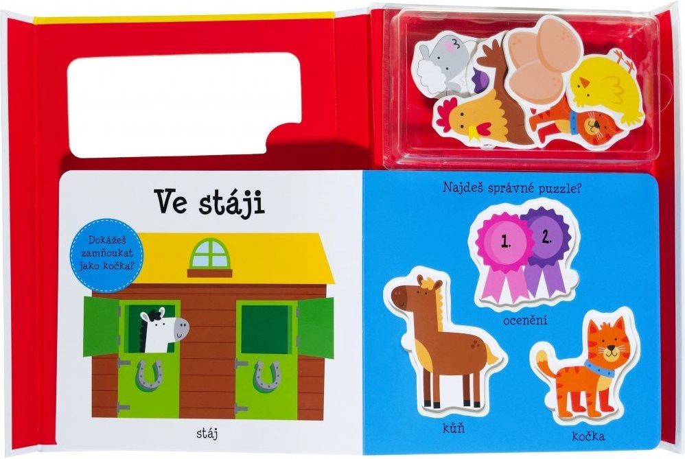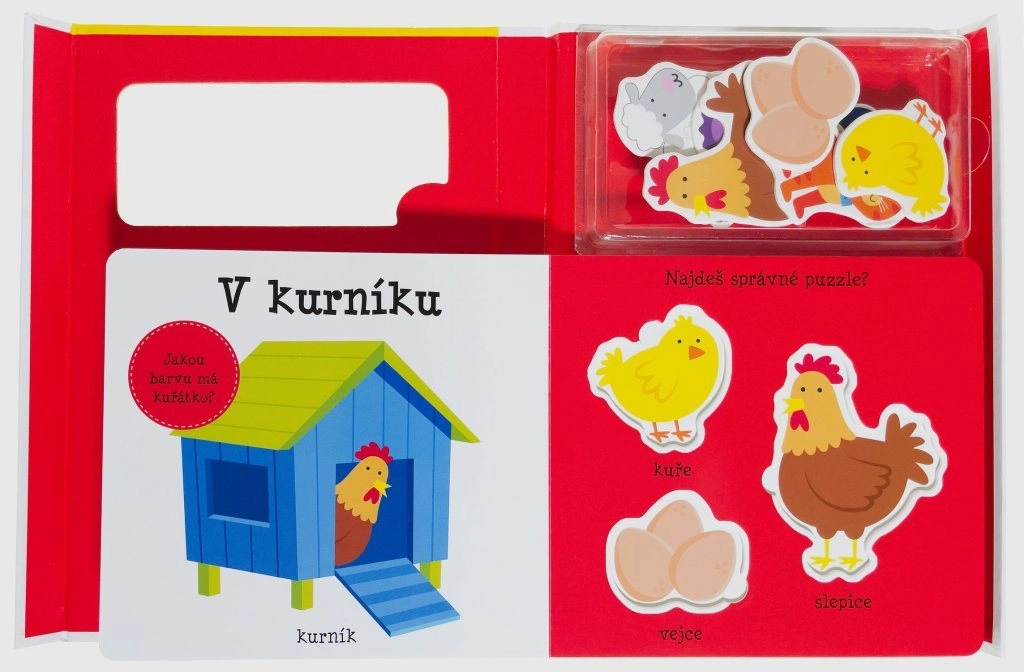 En illustreret bog med indlagte puslespilsbrikker, der på en sjov måde introducerer børn til gårdmiljøet, farver og dyr. Understøtter finmotorik, udvikling af ordforråd og træning af tilegnet viden.