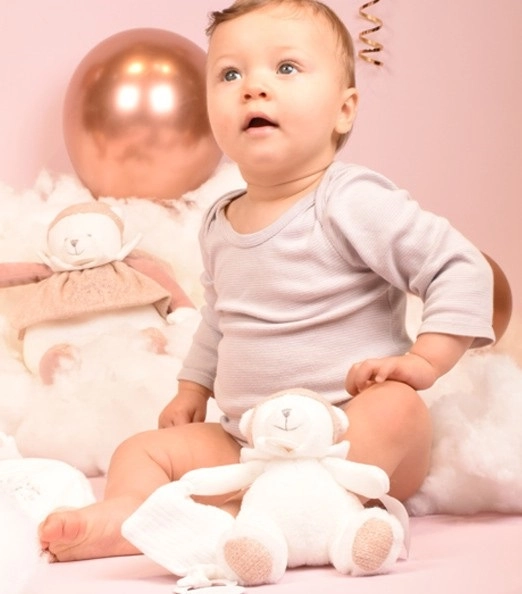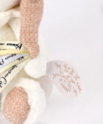 Denne blide doudou-bamse er mere end bare et legetøj – den er en krammeven, et beroligende tæppe og en praktisk hjælper i ét. I enden af tæppet finder du en sutteholder, som sikrer, at sutten altid er ved hånden og ren. Den sarte lyserøde hætte, den hvide krave og de broderede detaljer giver bamsen et venligt udtryk, som børn straks vil elske.