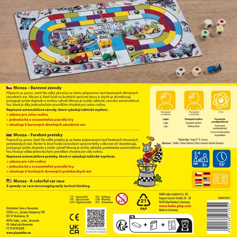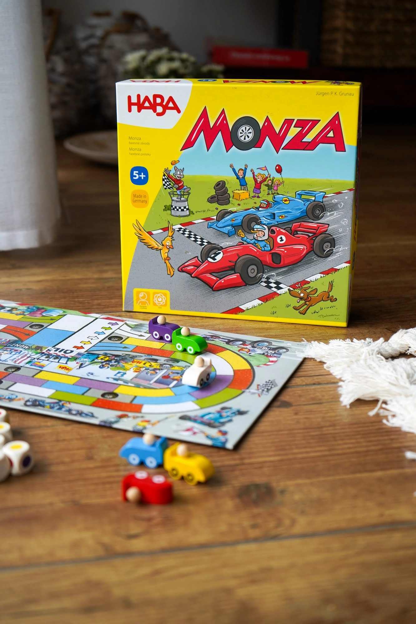 Det underholdende familiespil Monza fra Haba byder på hurtige løb fulde af taktik og held. Takket være de enkle regler er det ideelt for både børn og voksne, det spilles af 2–6 spillere, og én runde tager kun ca. 15 minutter.