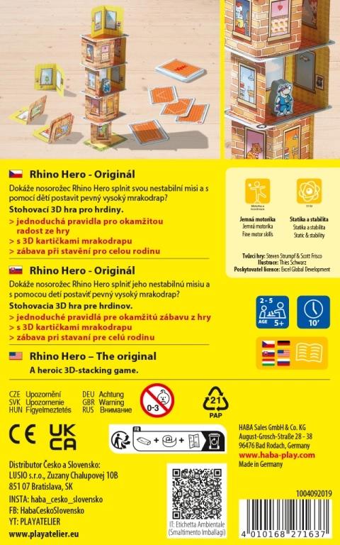 Indhold og spilforløb: Spillerne skiftes til at lægge vægge og lofter efter symbolerne på kortene og flytter Rhino Hero-figuren op ad det stadig højere tårn. Den, der holder rolig hånd og ikke vælter skyskraberen, vinder!