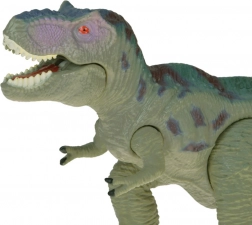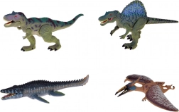 I pakken finder du fire forskellige arter: pterodaktyl (flyver og bevæger hoved og bagben), T-rex (klaprer truende med kæberne og bevæger for- og bagben), spinosaurus (bevæger kæber, lemmer og hale) og kronosaurus (åbner gabet og bevæger finnerne). Hver figur er lavet af kvalitets- og robust plast, som tåler hyppig leg.