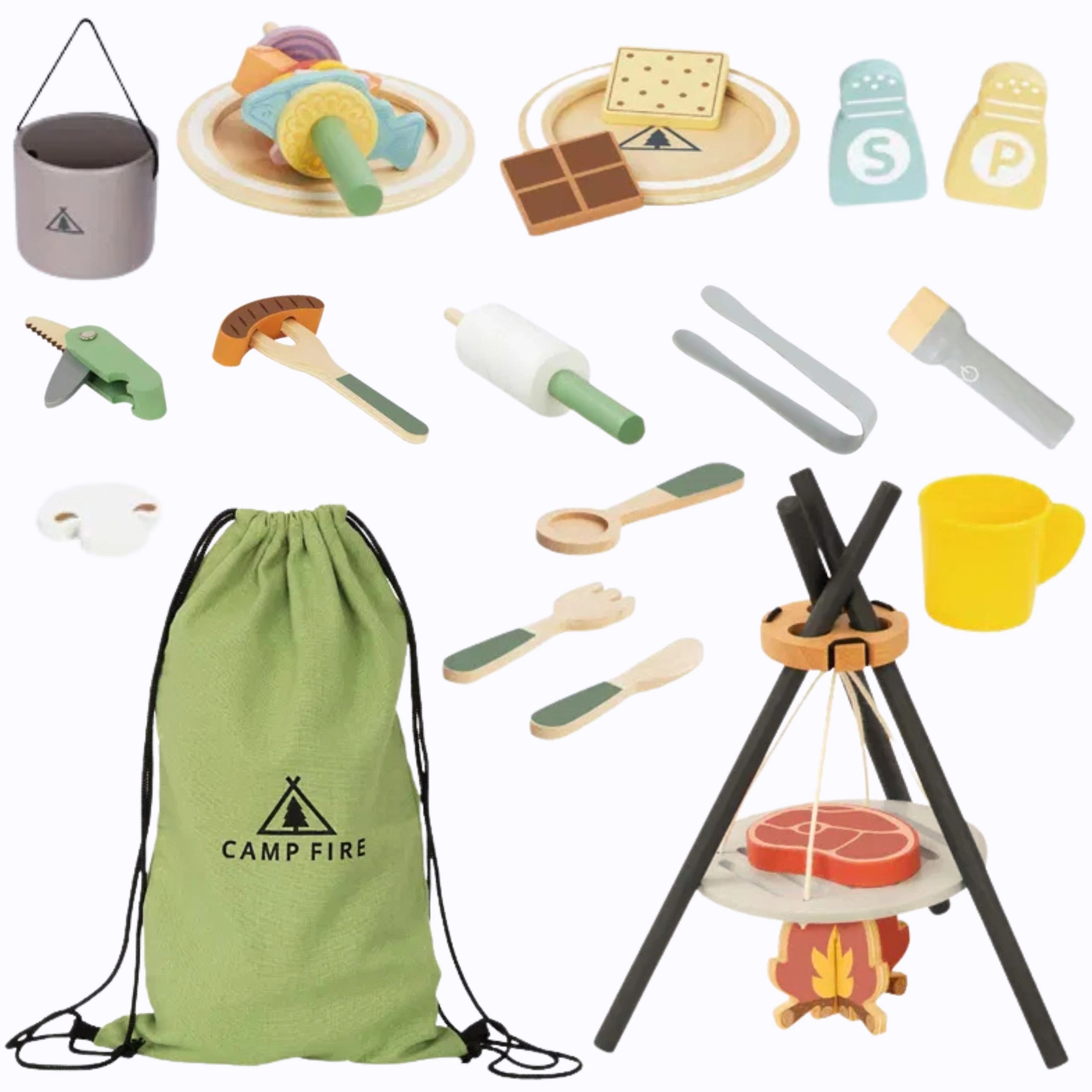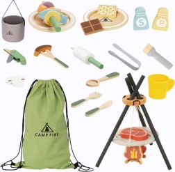 Dette originale sæt tager børn med ind i campingens verden: telte, lejrbål og madlavning med venner. Trædelene er behagelige at røre ved og holdbare, samtidig sikre til daglig leg. Ideelt til børn fra 3 år, som elsker at efterligne voksne og træne sociale færdigheder.