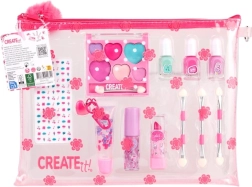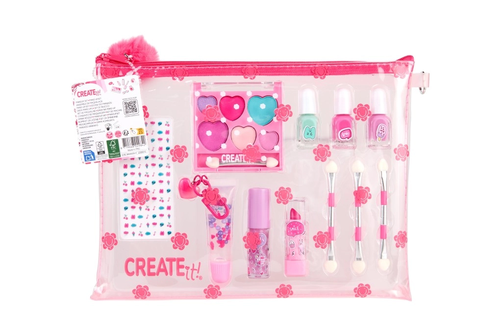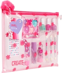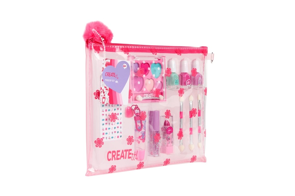 Et sødt børnemakeup-sæt i en gennemsigtig lille taske er ideelt til små stylister. Det indeholder alt, hvad der skal til for legende makeup og neglepynt: 3 neglelakker, lipgloss, læbepomade, 3 applikatorer og negleklistermærker. Den praktiske taske med pom‑pom pynter og holder samtidig alle kosmetikting samlet.