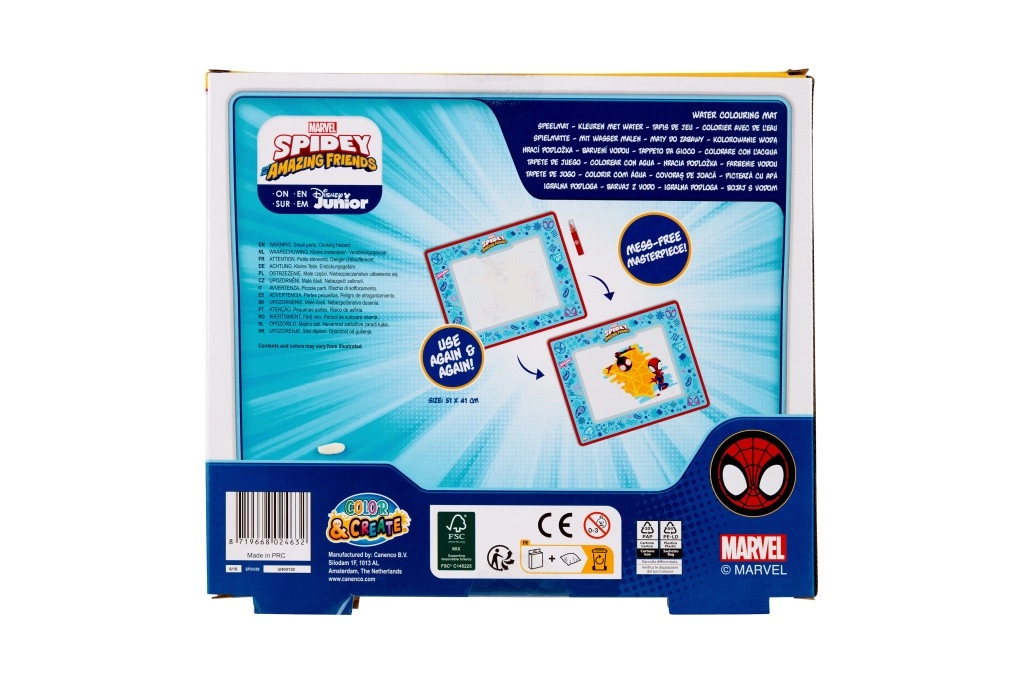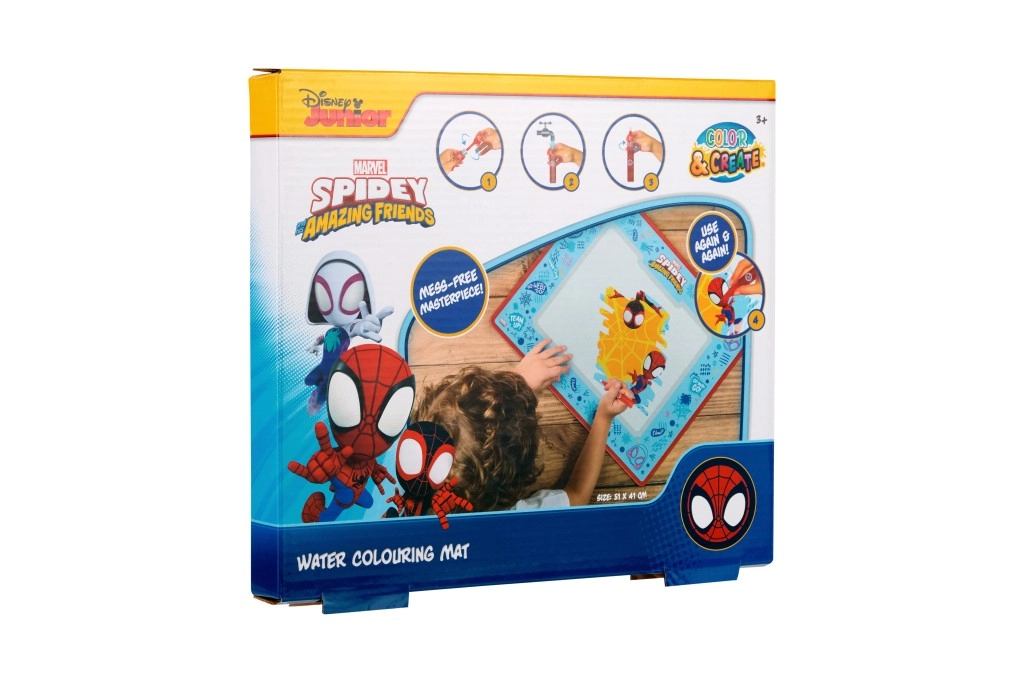 Oplev legende og ren kreativ leg: vandmalemåtte med superhelten SPIDEY. Fyld den specielle pen med vand og mal – billederne forsvinder, når de tørrer, så du kan skabe igen. Genanvendelig, uden rod og ideel derhjemme og på farten.