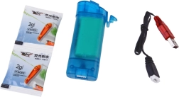 Inkluderer et 7,4 V 500 mAh batteri, USB-oplader og to poser til tilberedning af fluorescerende vand til effektfuld natte-skydning.