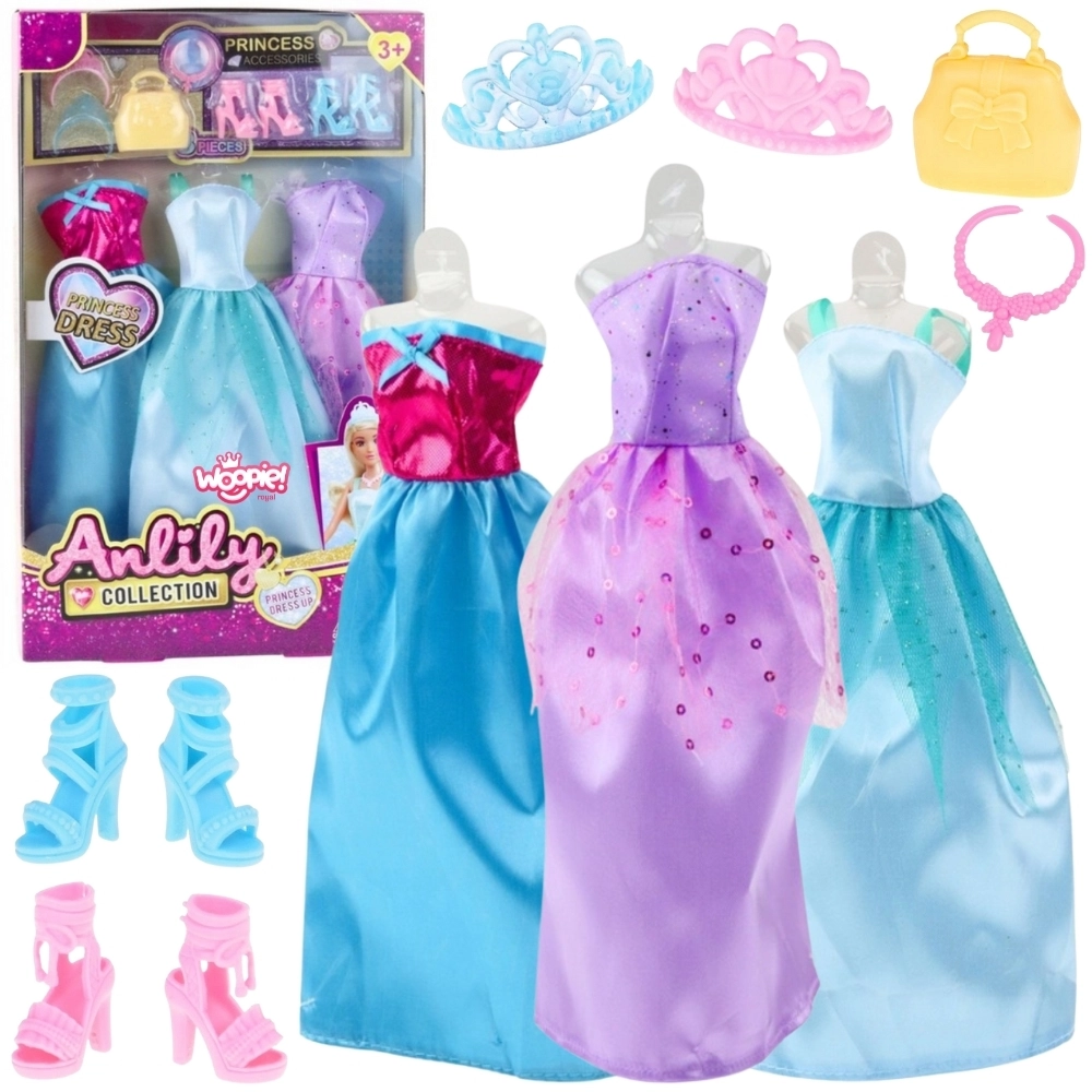 - 11-delt sæt – kjoler, sko, kroner, håndtaske og halskæde til utallige kombinationer.